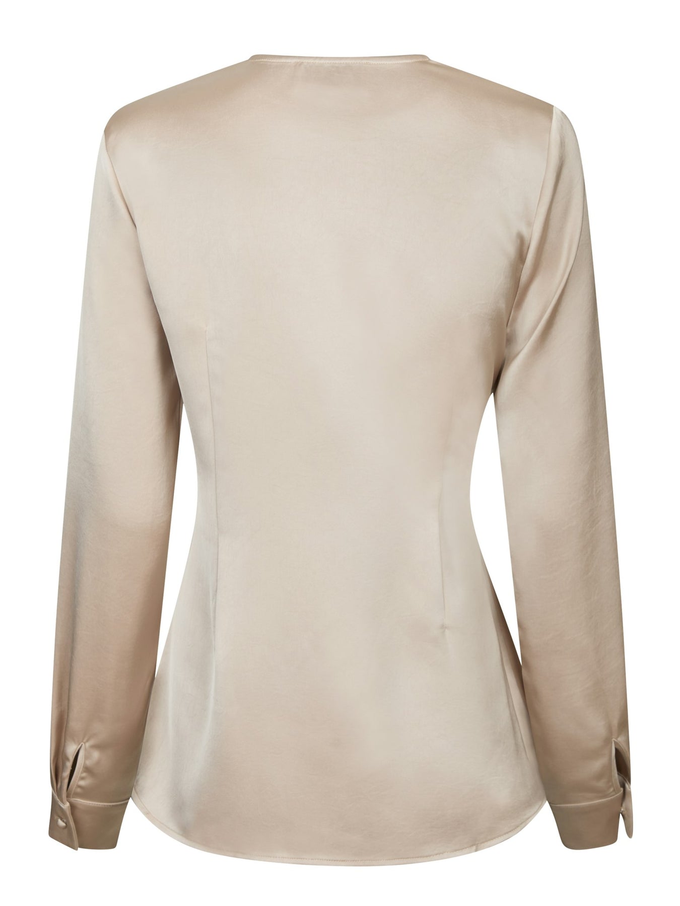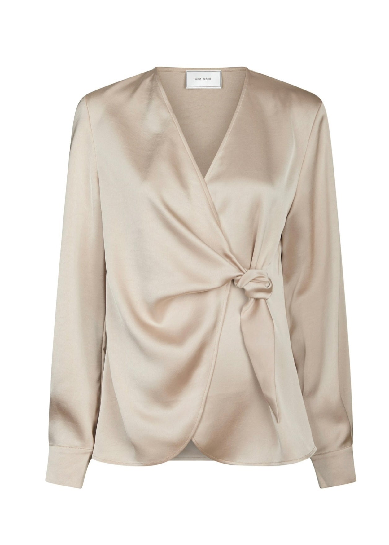 Elegant champagnefarvet bluse fra Neo Noir i en blød og behagelig kvalitet. Blusen har en smuk satinstruktur med en let stretch, hvilket giver en god pasform og komfort gennem dagen. Den har en klassisk halsudskæring og en tidløs silhuet, der gør den velegnet til både hverdag og festlige lejligheder.