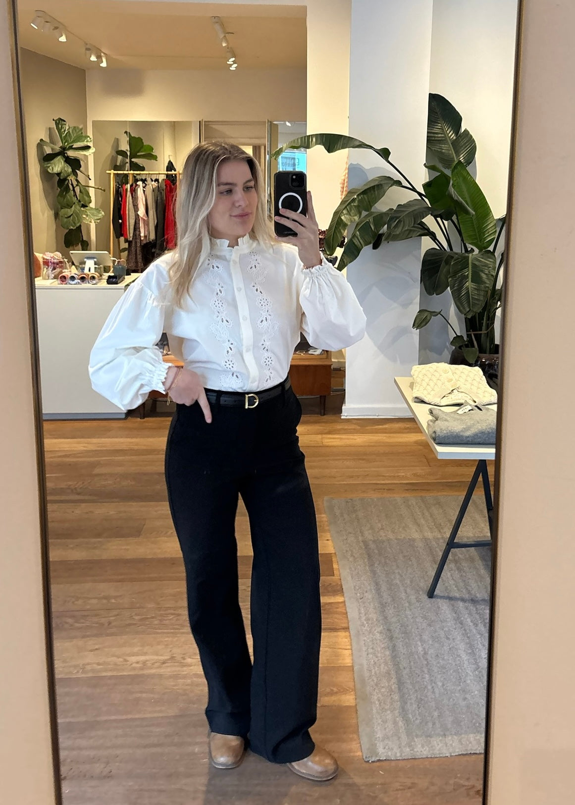 Fin skjortebluse fra Part Two. Blusen har en løftet hals, broaderi anglaise mønster foran foran, samt knapper fra top til bund.