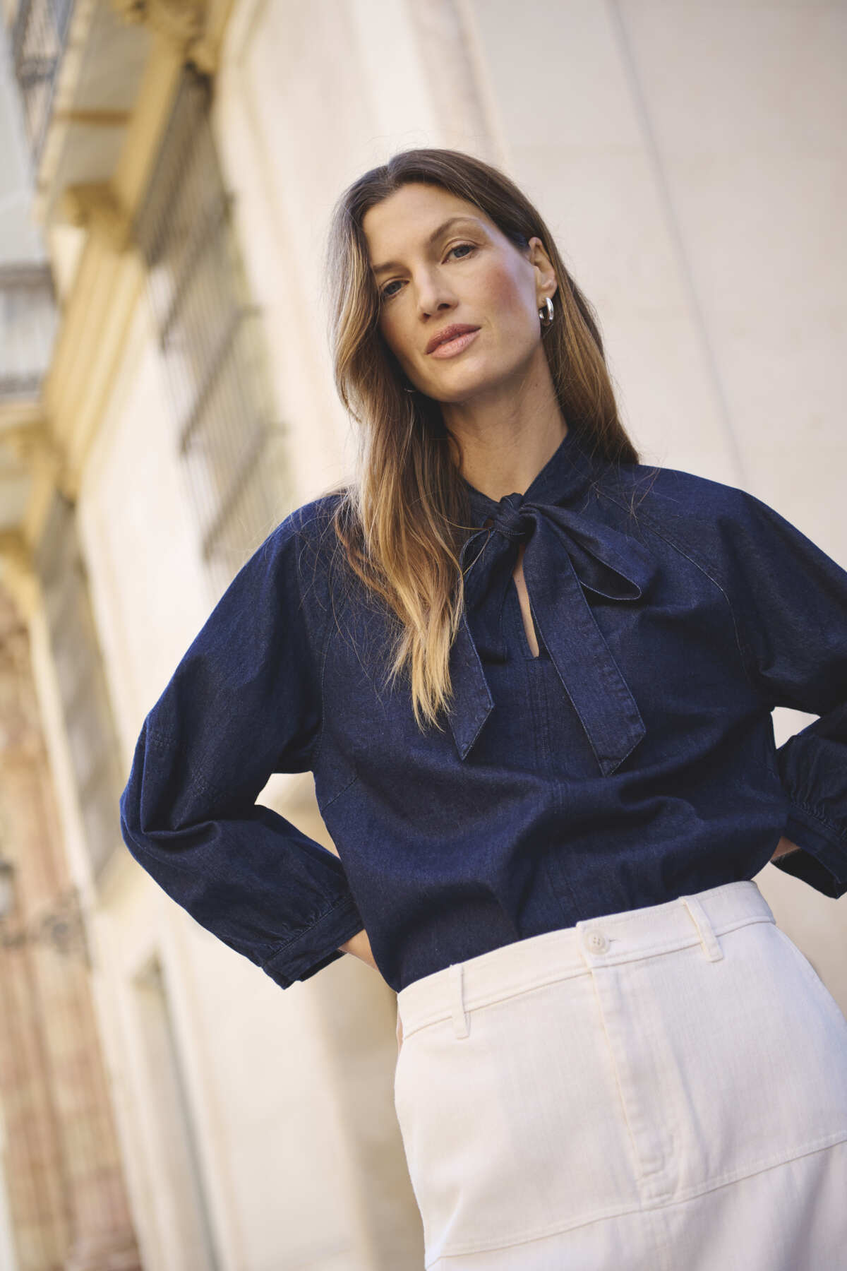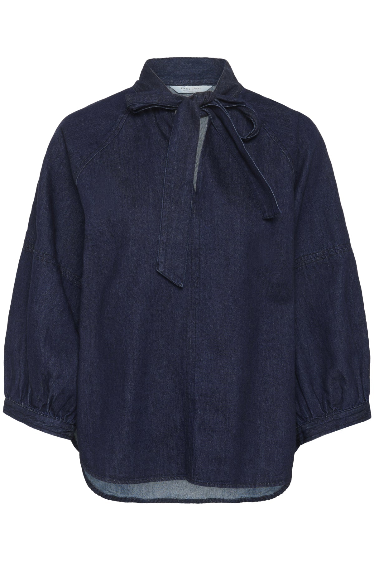 Flot mørk denimskjorte fra Part Two med bindebånd i halsen og en løs pasform.