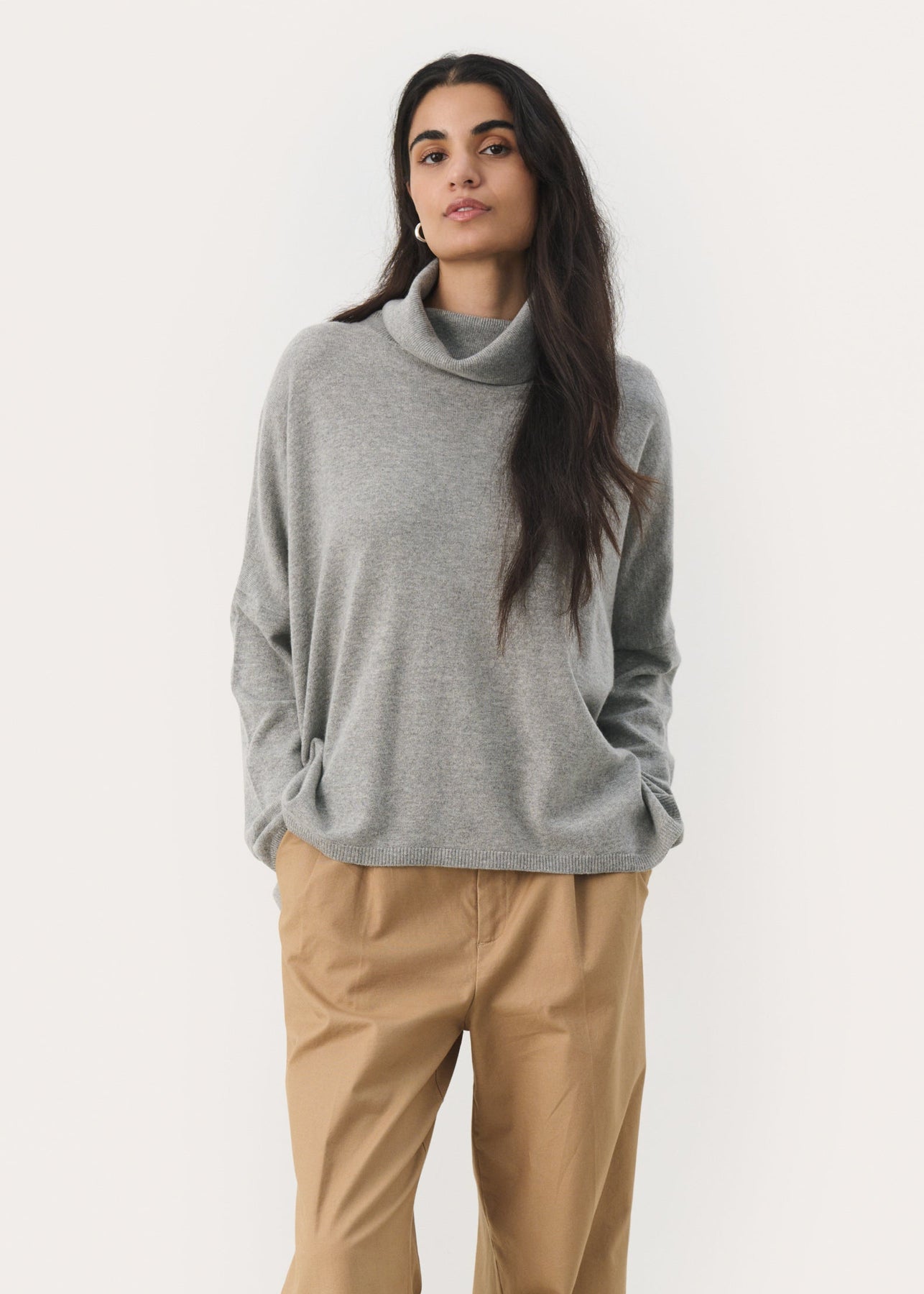 Lækker oversize pullover fra Part Two. Pulloveren har høj hals, lange ærmer, en løs, bred pasform og er længere bagpå end foran.
