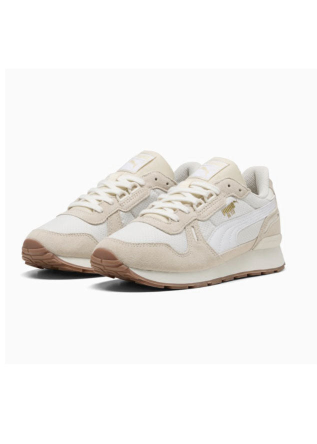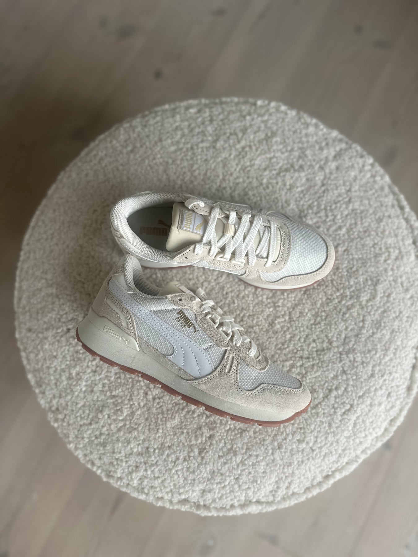 Cool retro sneakers fra Puma. Skoene er hvide og beige med hvid stribe på siden og gummisål.