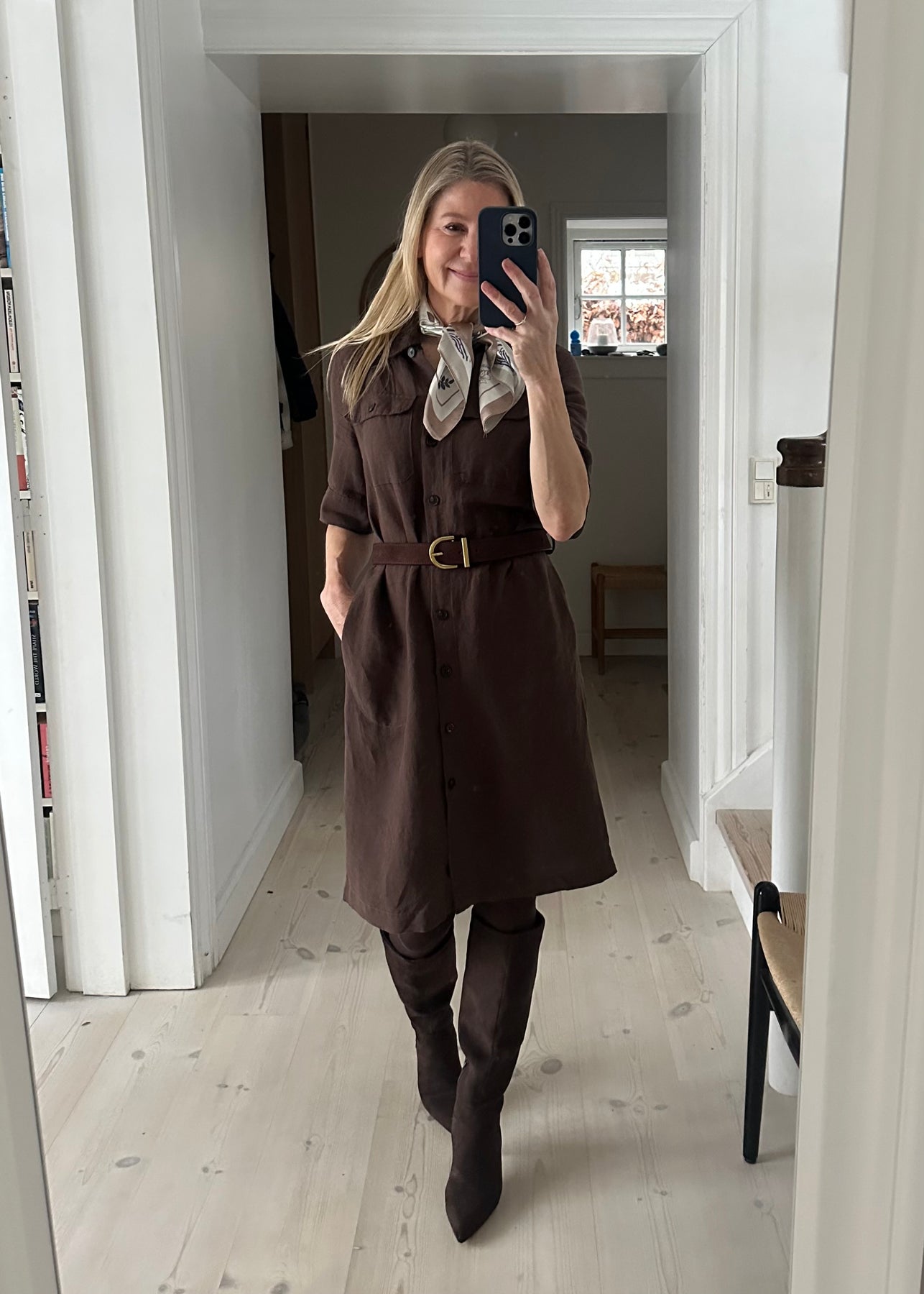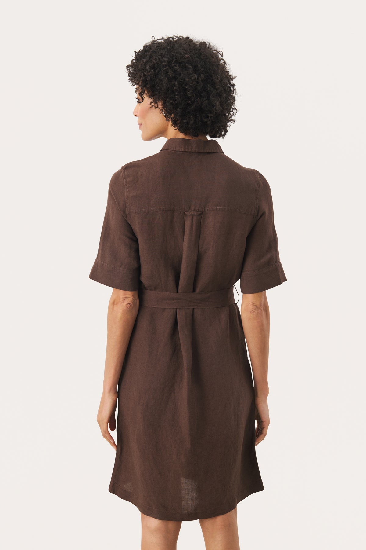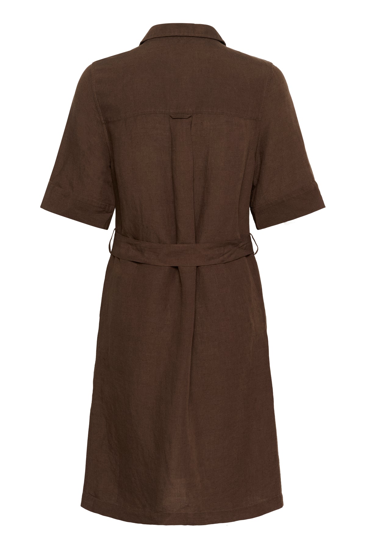 Brun skjortekjole fra Part Two. Kjolen har skjortekrave, knaplukning foran, korte ærmer og bindebånd i livet.