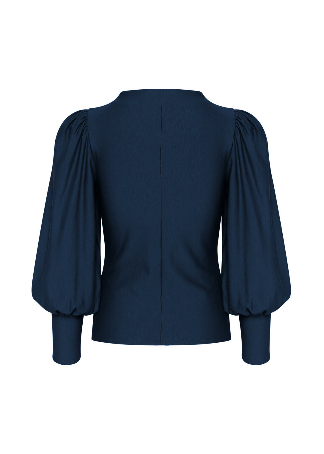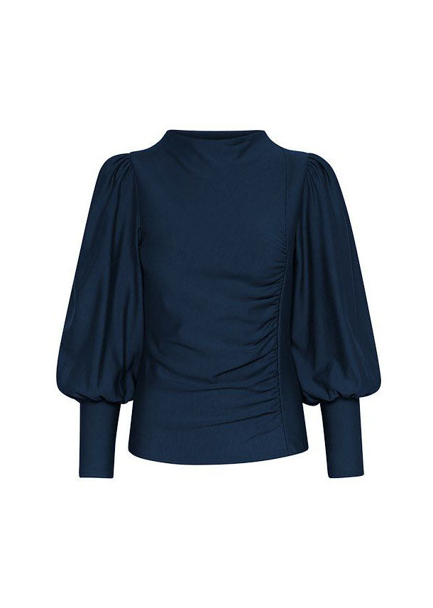 Fin mørkeblå bluse med rynkede detaljer og pufærmer. Blusen har en høj halsudskæring, lange ærmer og en slank pasform.