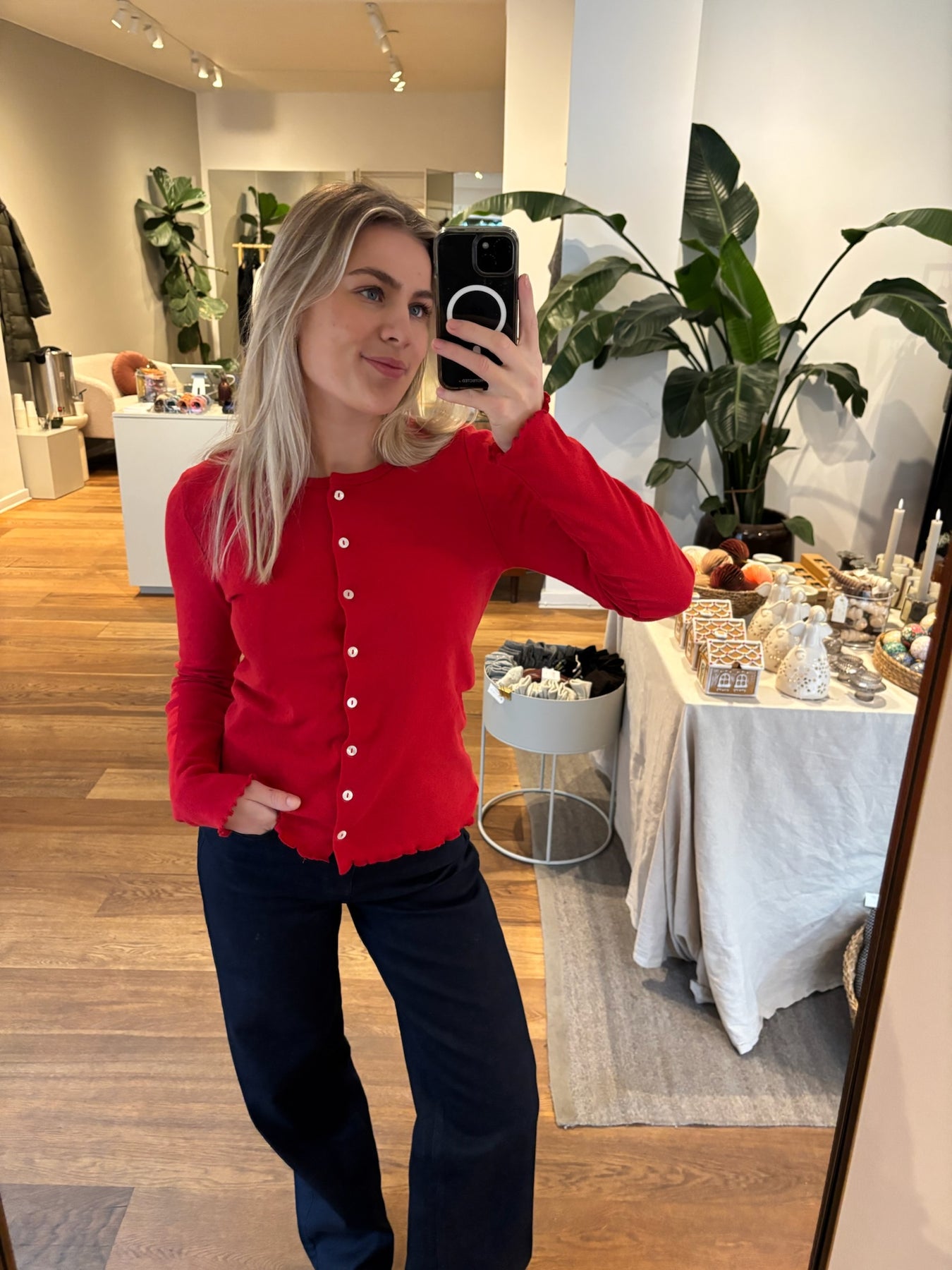 Fin cardigan fra Soaked in Luxury med små hul-detaljer og flæsedetaljer ved ærmer og liv. Cardiganen lukkes foran med hvide knapper.