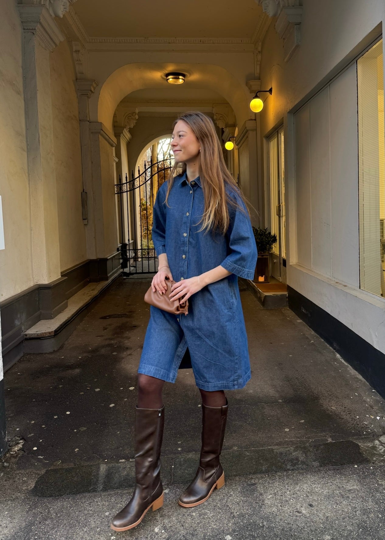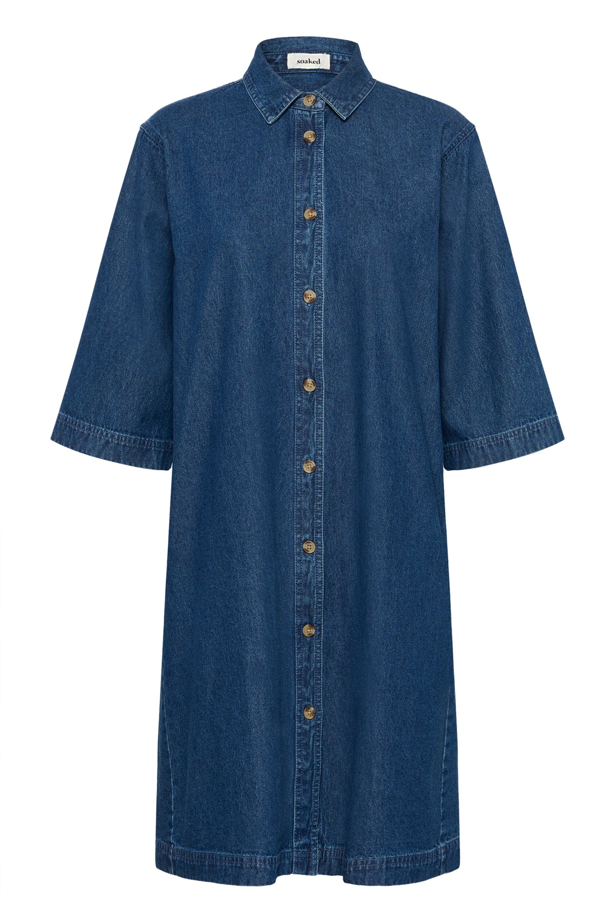 Skøn denimkjole fra Soaked in Luxury. Kjolen har A-form, 3/4 lange brede ærmer, klassisk krave, knaplukning og sidelommer.