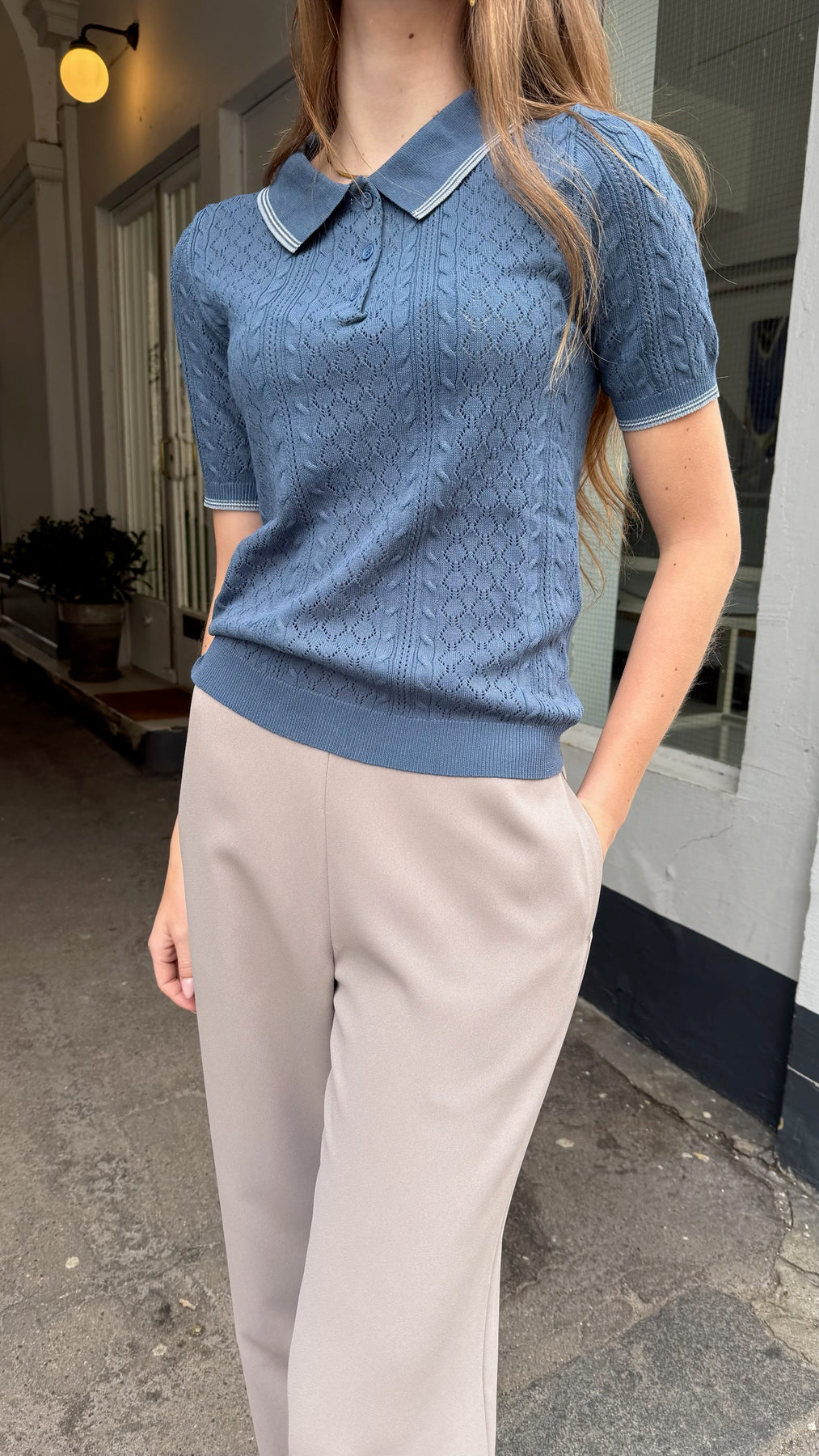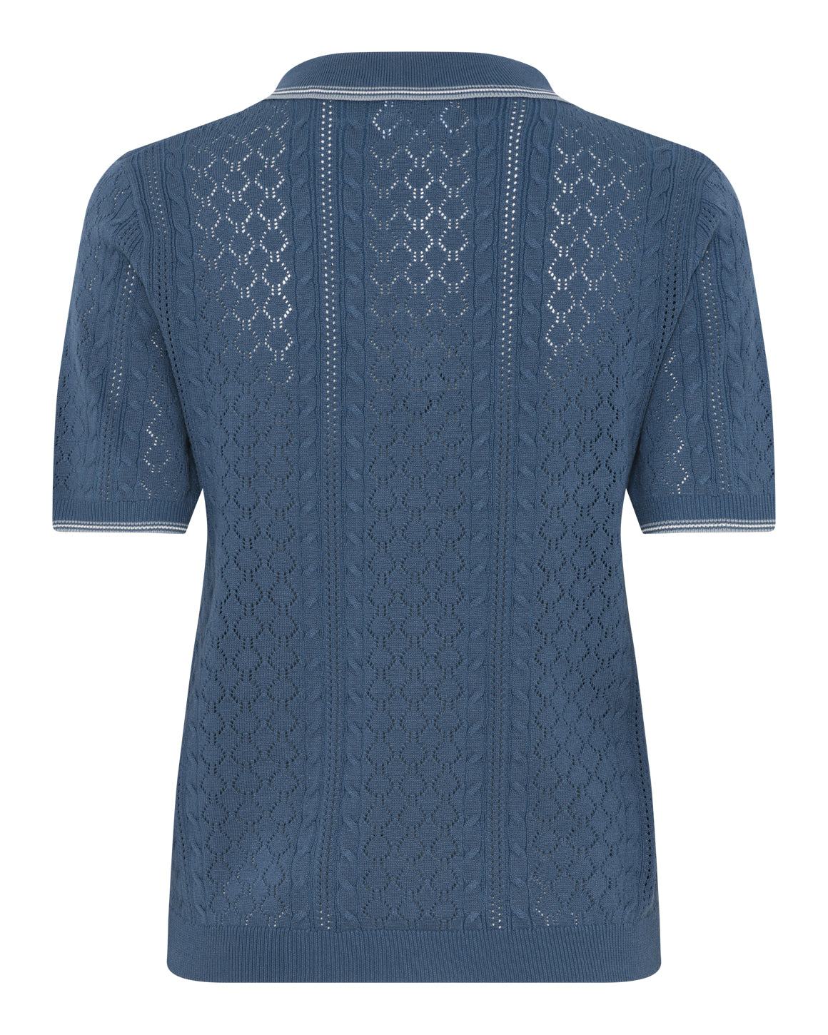Skøn hulmønstret polo i støvet blå med kontraststriber på kraven. Poloen er i let og åndbar viscose.