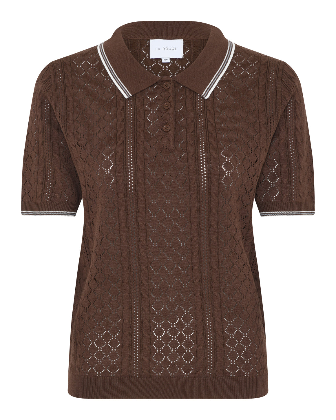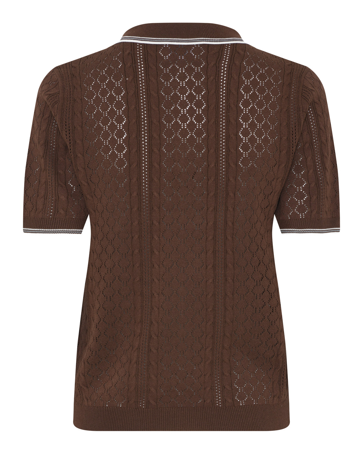 Skøn hulmønstret polo i flot brun farve med hvid kontraststribe på kraven. Poloen er i let og åndbar viscose.