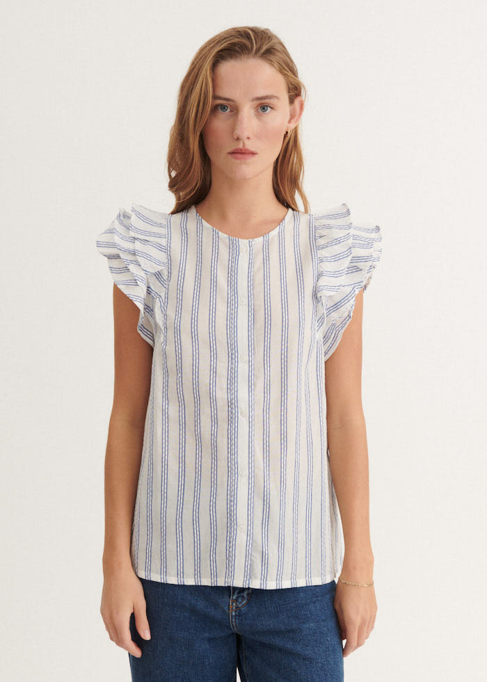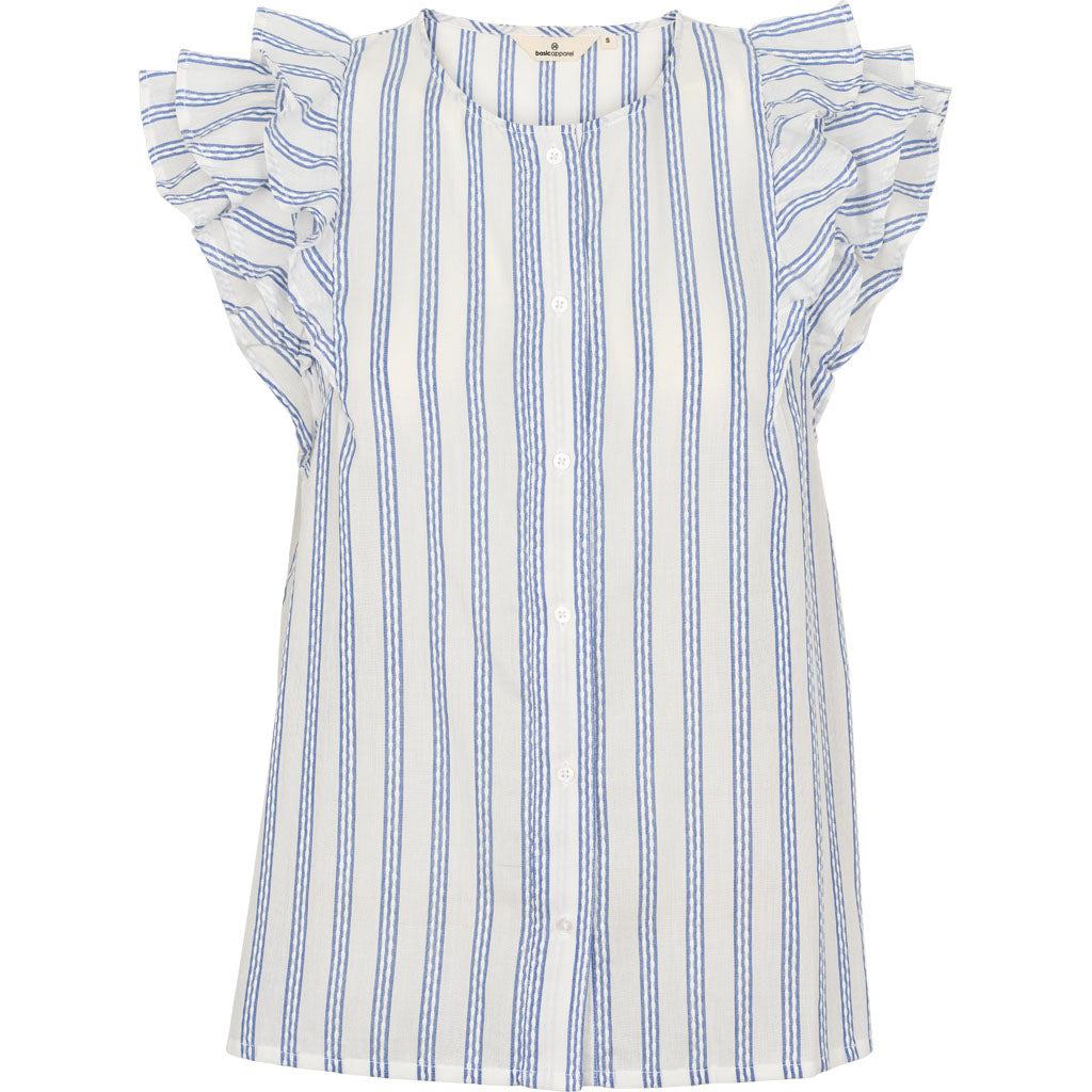 Sød bluse fra Basic Apparel. Blusen har blå og hvide striber, flæser i ærmerne og lukkes foran med knapper.