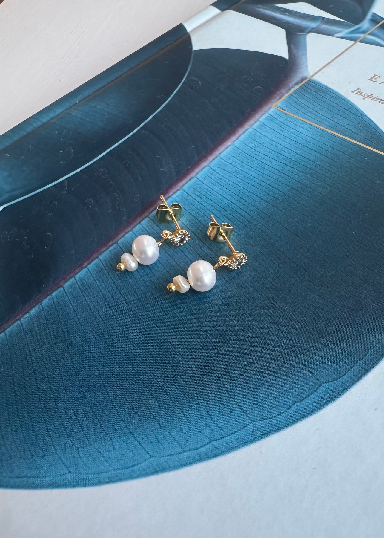Smukke øreringe med ægte perler fra Camilla Folkmann. De består af ørestikkere med lille zirkon foran og perler der hænger nedenfor.