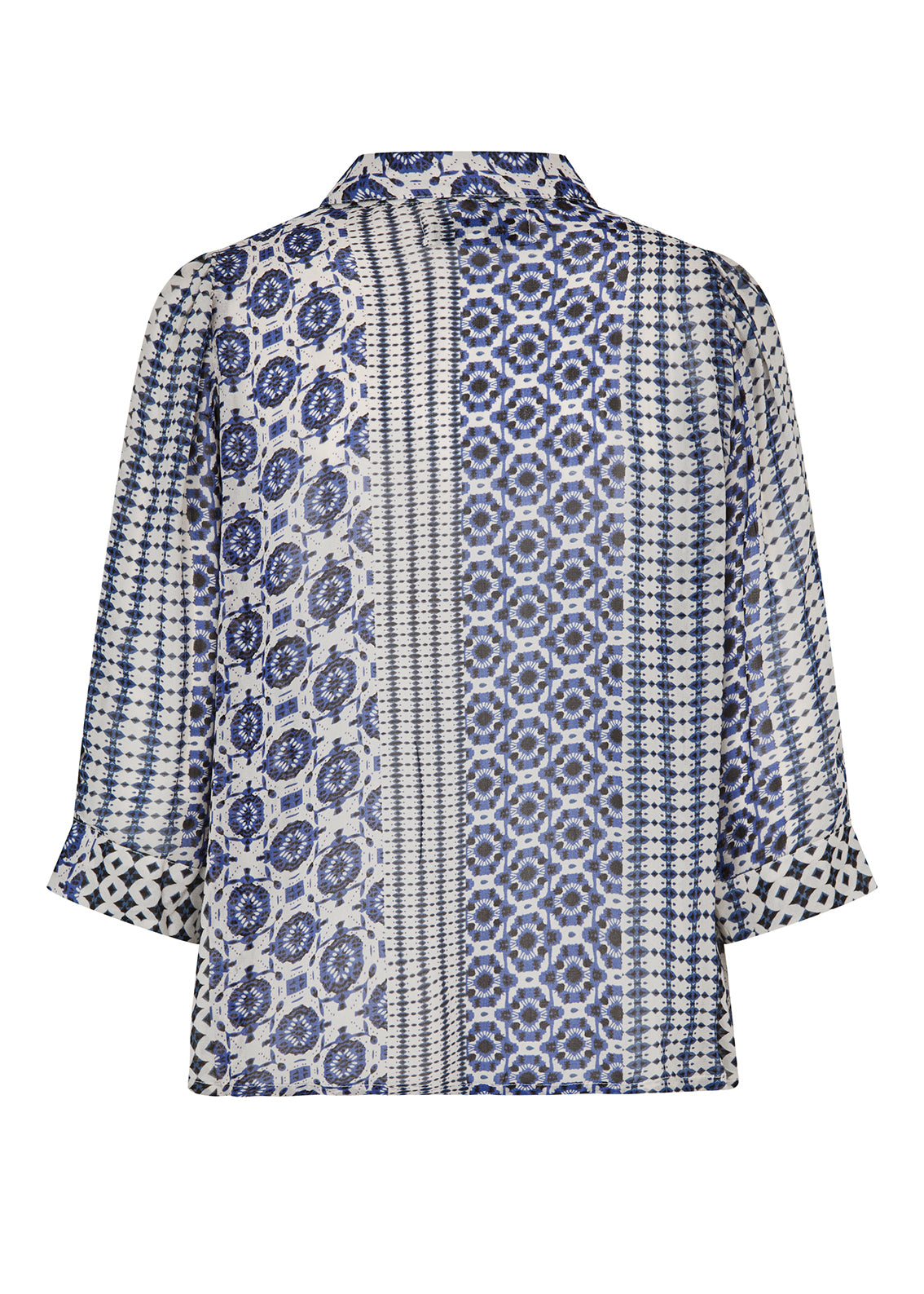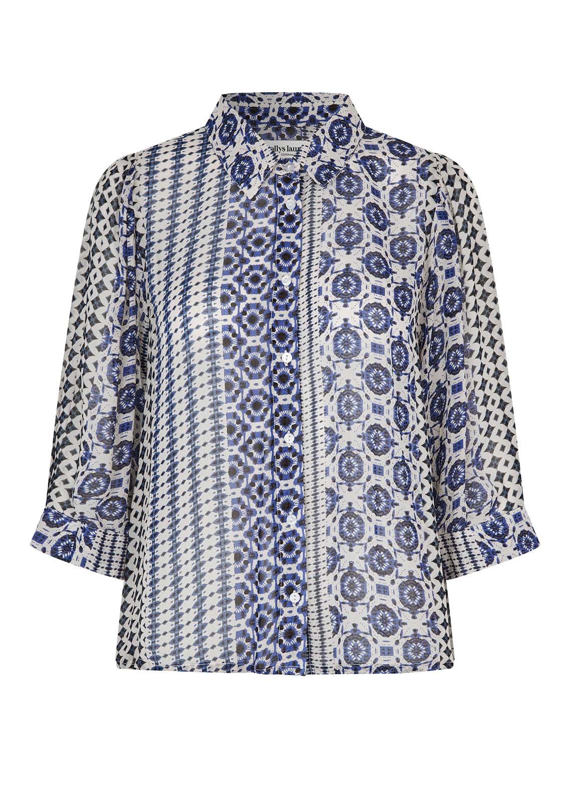 Blå- og hvidmønstret skjorte fra Lollys Laundry. Skjorten har en 3/4 ærmelængde og lukkes med knapper foran.