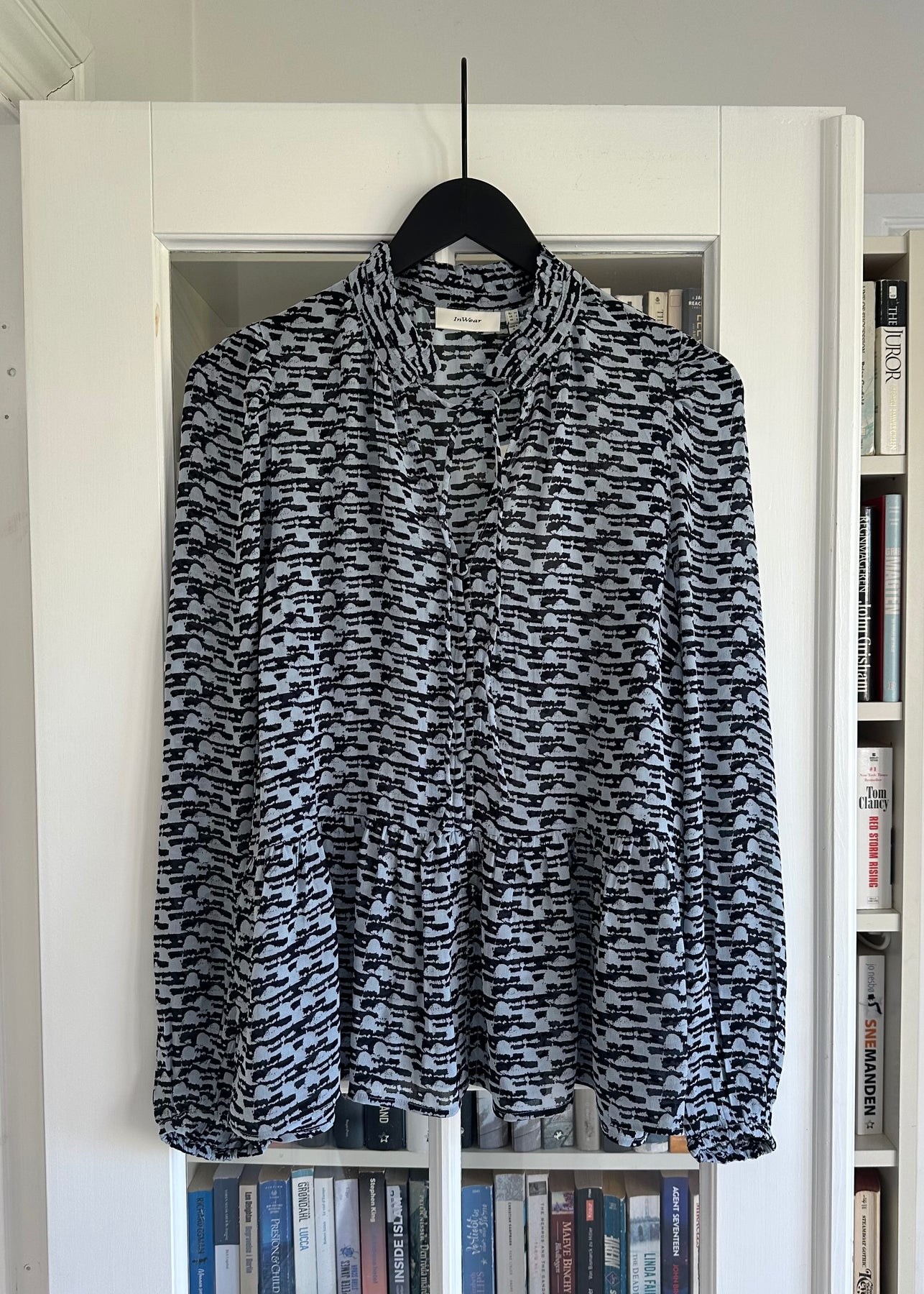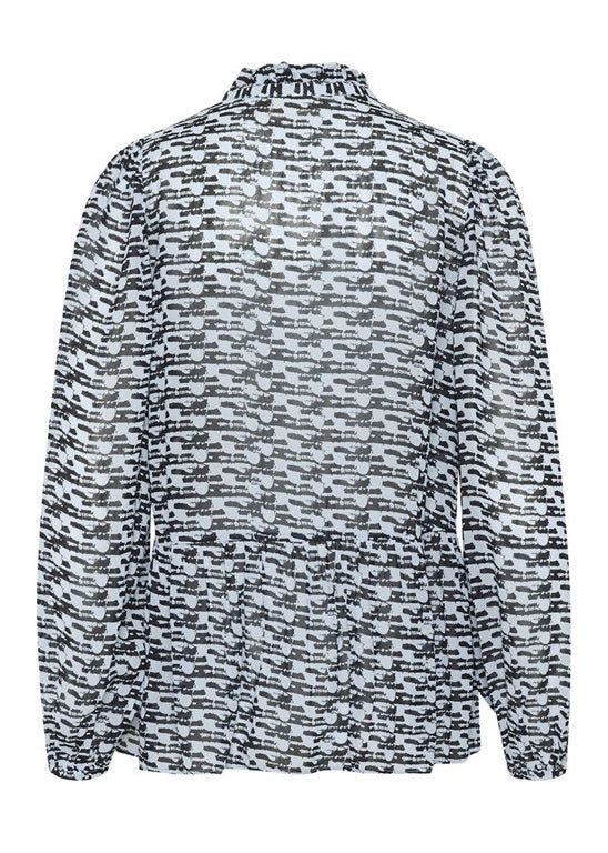 Flot mønstret bluse fra InWear. Blusen har en løs pasform med lange ærmer og høj hals. Den har en nøglehulsudskæring i halsen med bindebånd, så halsudskæringen kan justeres. Blusen har fin detalje med læg forneden og puf i ærmerne.