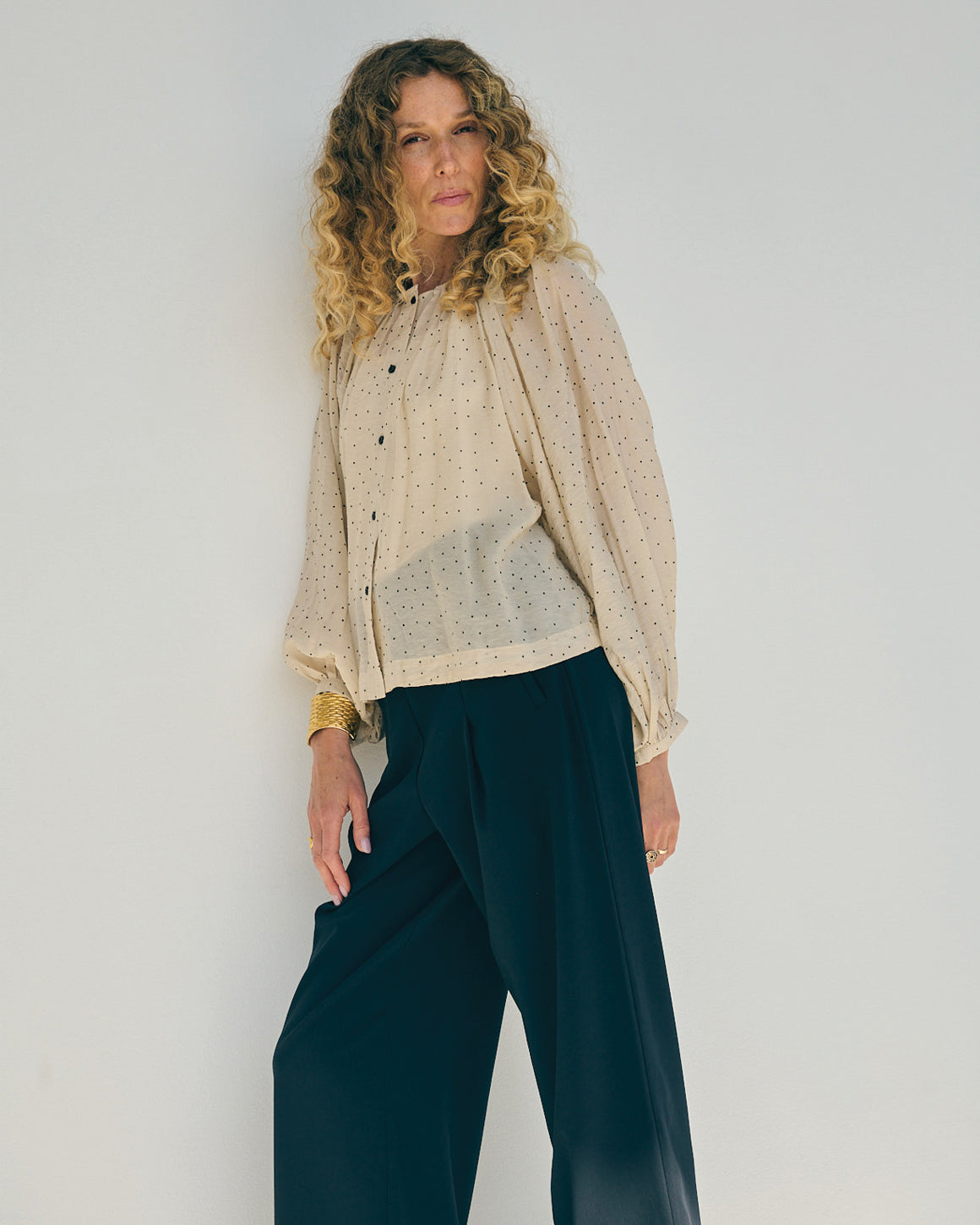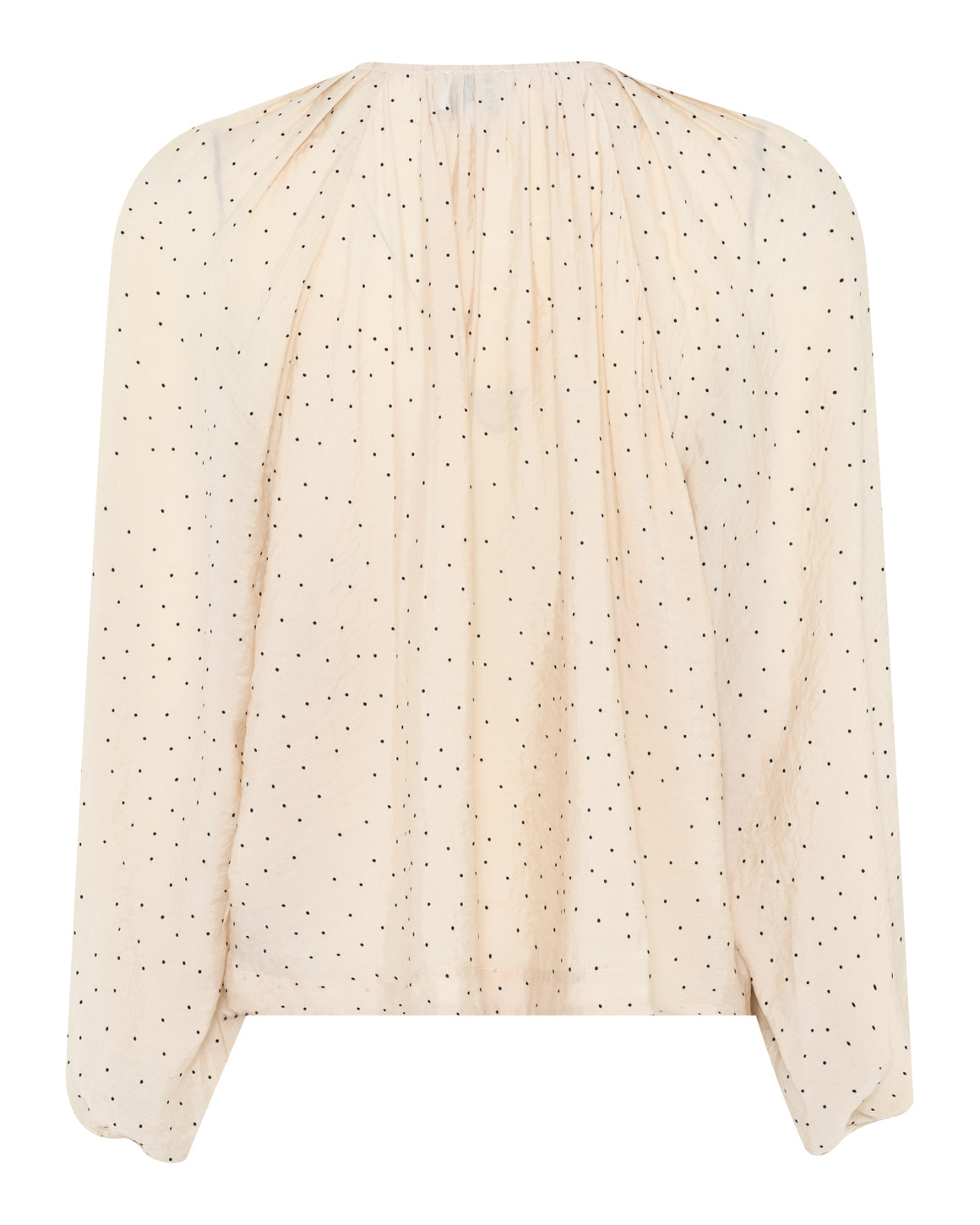 Fin let skjortebluse fra La Rouge i sand med sorte prikker. Skjorteblusen har rund hals, knaplukning, en løs pasform og lange ærmer.