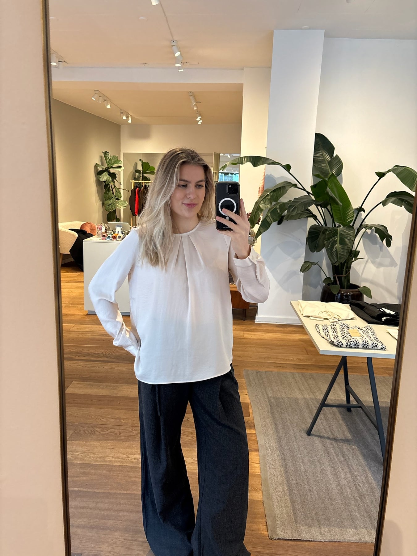 Fin cremefarvet bluse med rund hals, læg foran ved halen og knap i nakken.