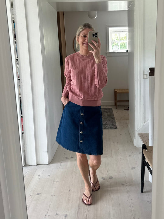 Stor i storlek. Modellen är 174 cm lång och använder storlek 26.