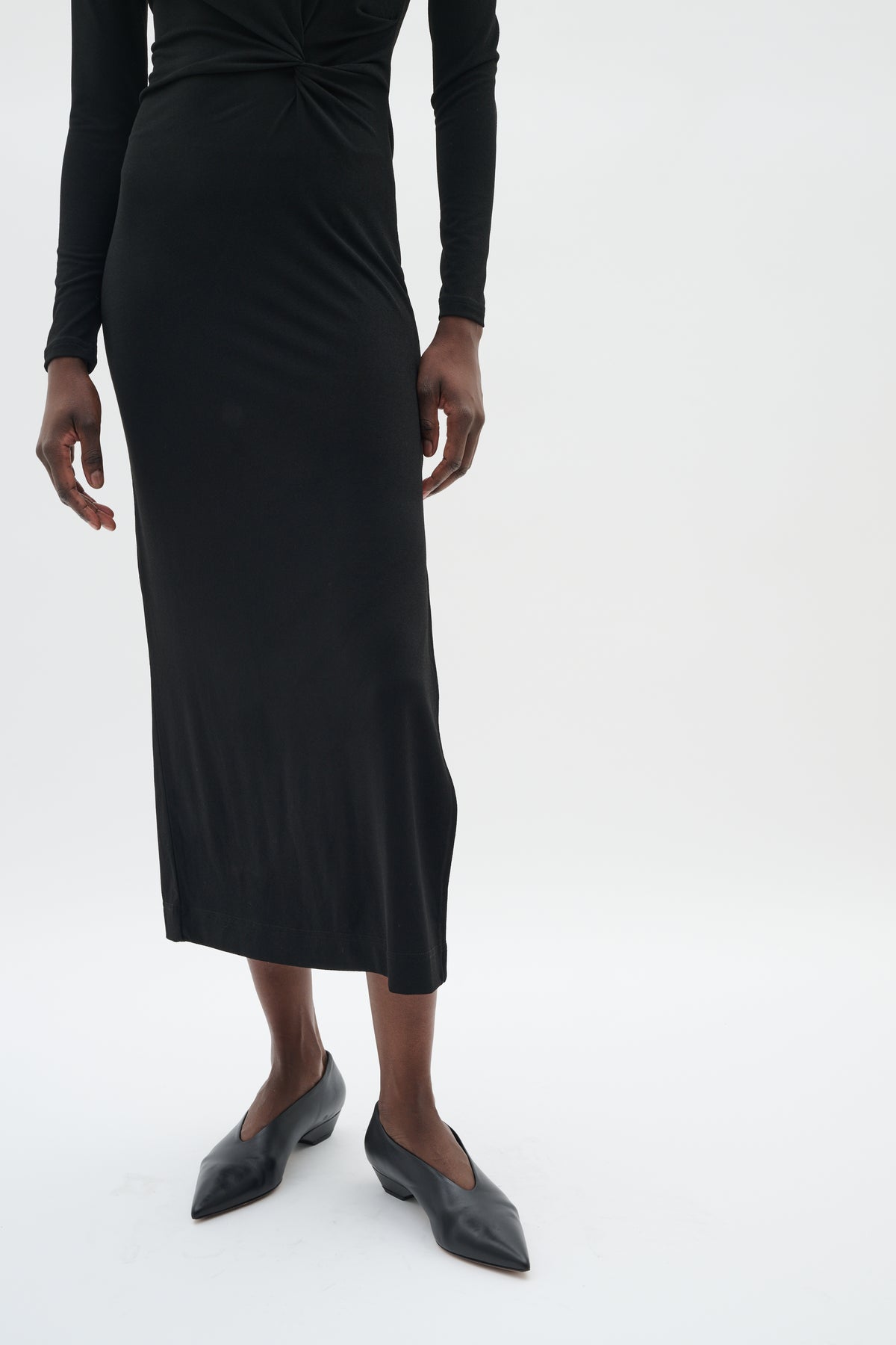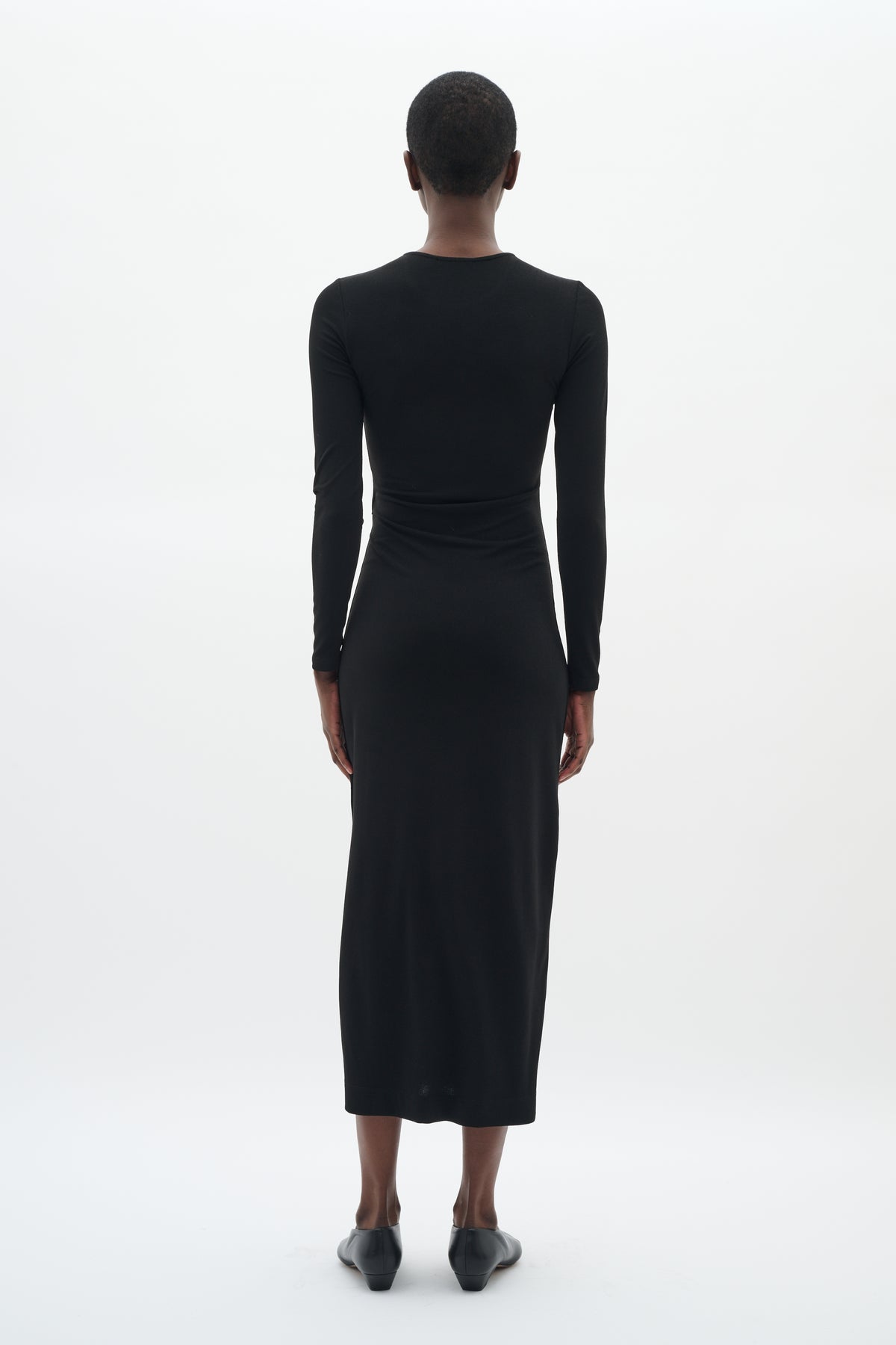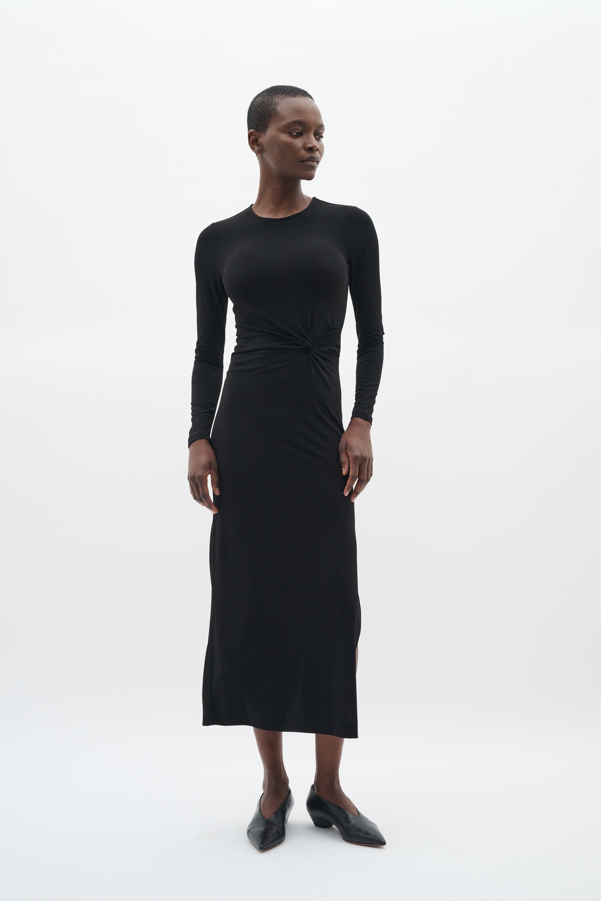 Flot sort kjole fra Inwear med drapering foran, lange ærmer og rund hals.