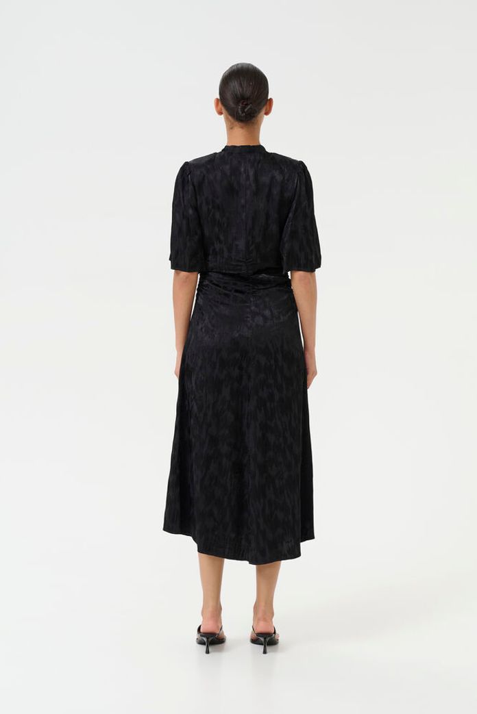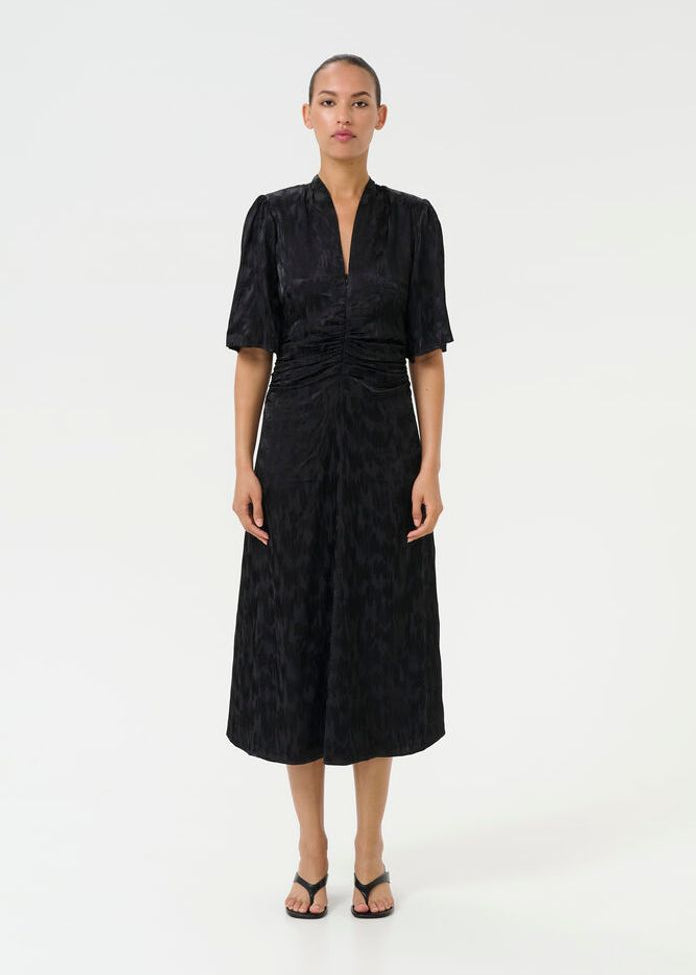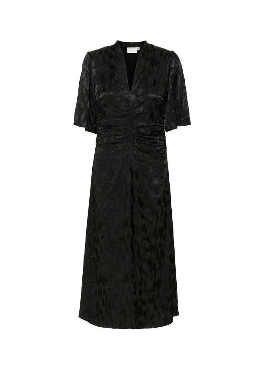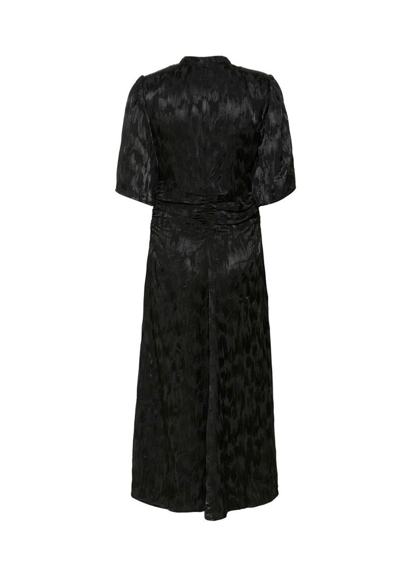 Smuk sort kjole fra Gestuz. Kjolen har korte ærmer og V-udskæring. Den har let rynkede detaljer ved taljen og har en vævet glansfuld struktur med et diskret mønster.