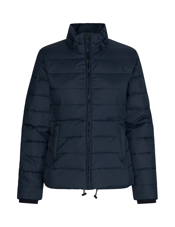 Let navy dunjakke fra Global Funk. Jakken har lynlås lukning, skrålommer med lynlås, justerbar elastiksnor nederst og opadstående krave. Pasformen er let figursyet.