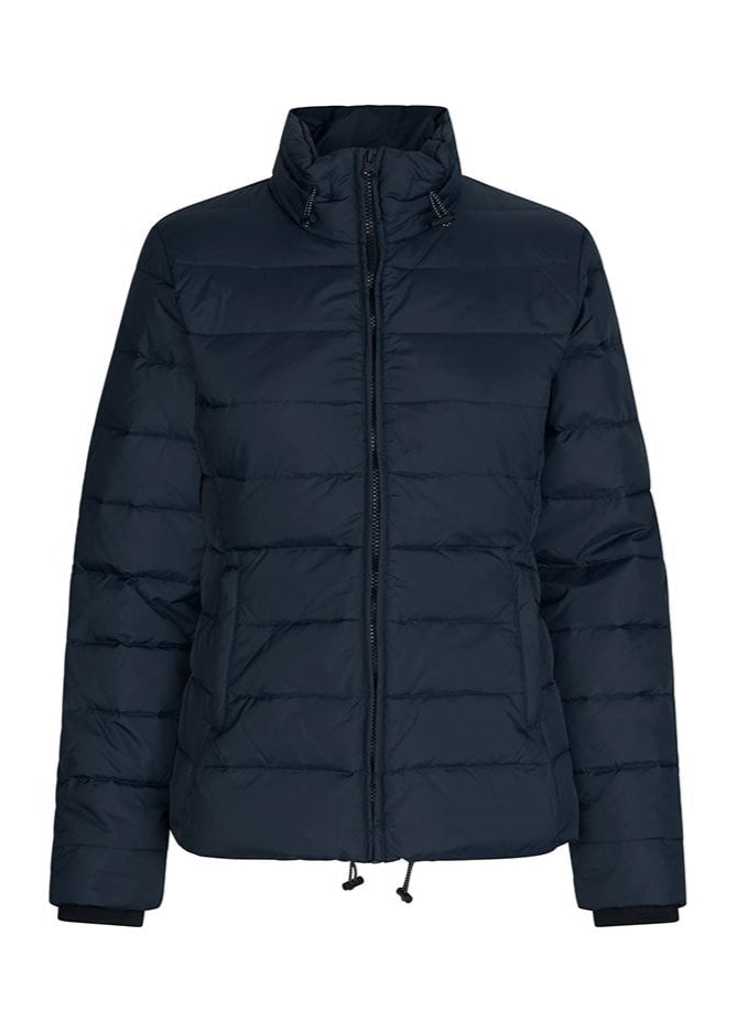 Let navy dunjakke fra Global Funk. Jakken har lynlås lukning, skrålommer med lynlås, justerbar elastiksnor nederst og opadstående krave. Pasformen er let figursyet.