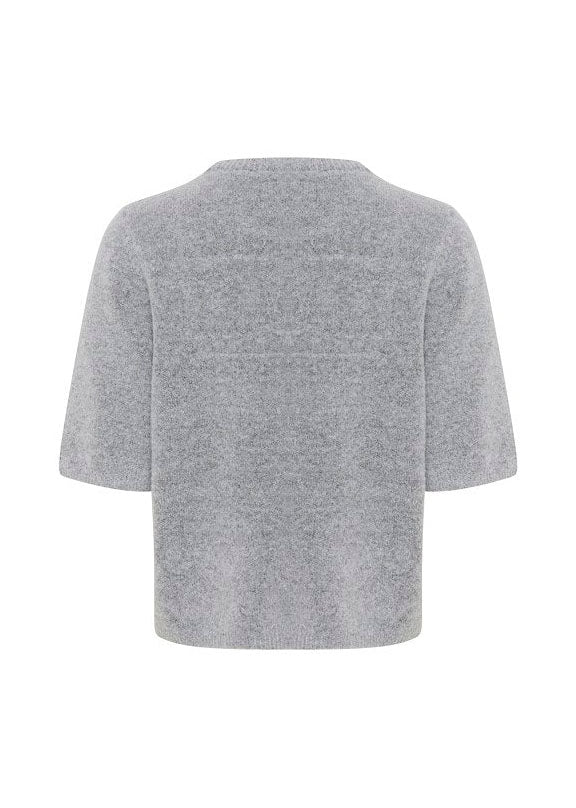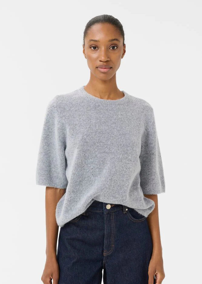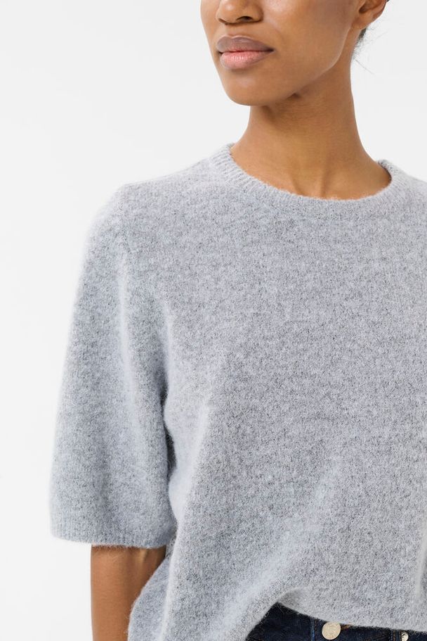 Kortærmet strik fra Gestuz i gråblå. Den har en rund halsudskæring og er lavet af en blød blanding af uld, alpaka og andre materialer.