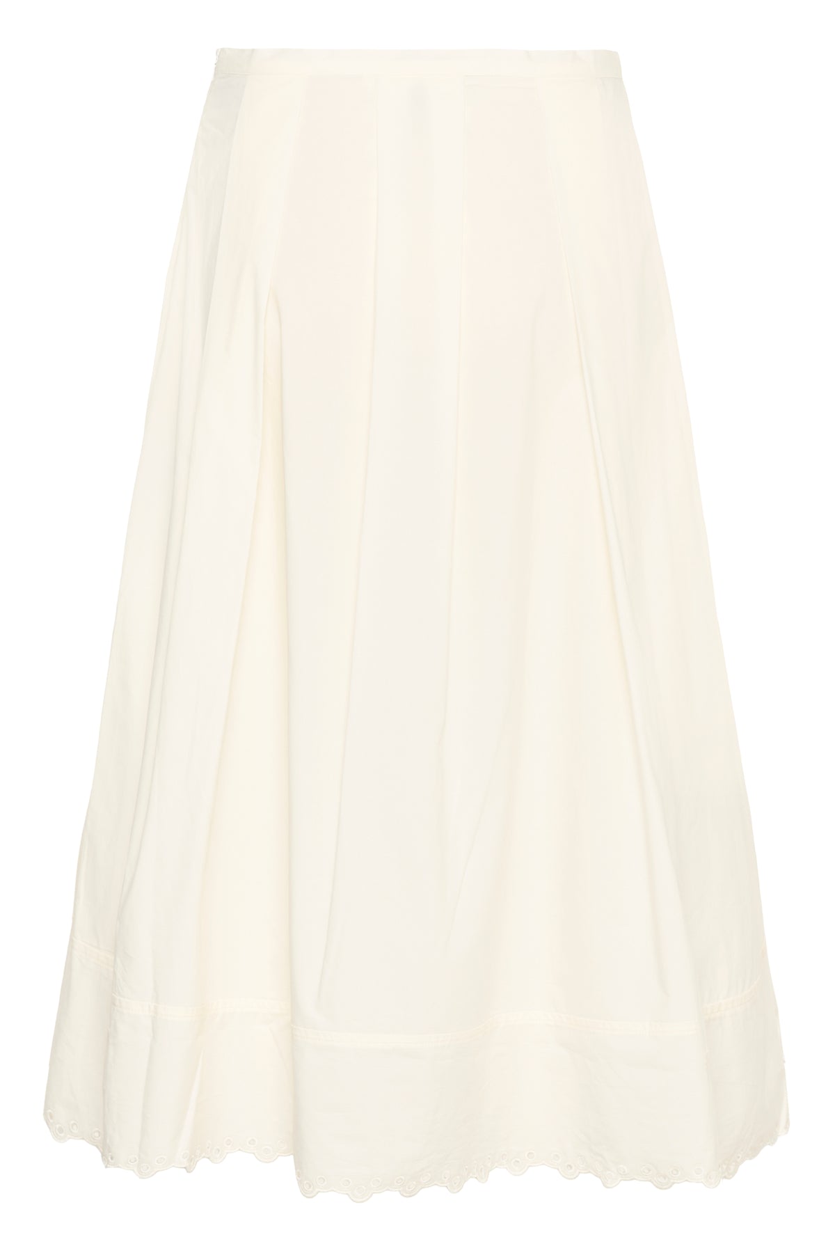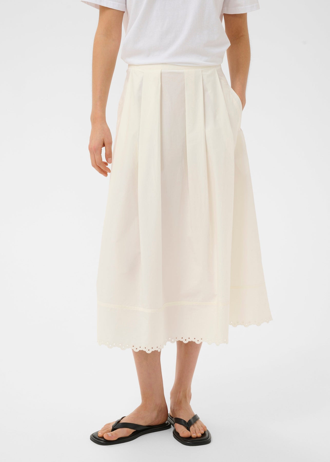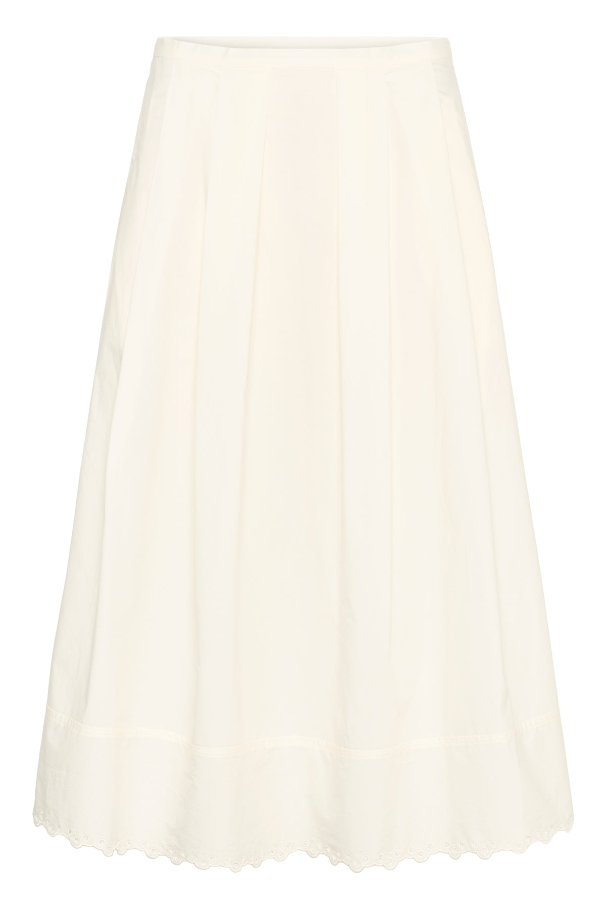 Skøn off-white nederdel fra InWear i en lækker bomuldskvalitet med fast lining, sidelommer og fin buet broderi anglais kant nederst.