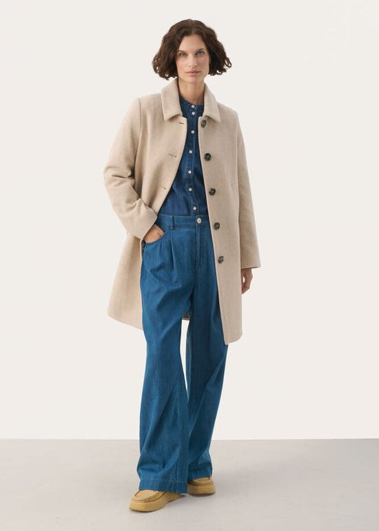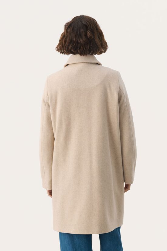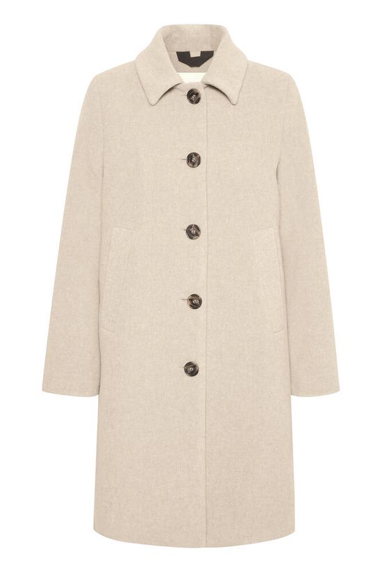 Smuk, klassisk lys uldfrakke fra Part Two. Frakken har krave, knaplukning foran, sidelommer og er foret.
