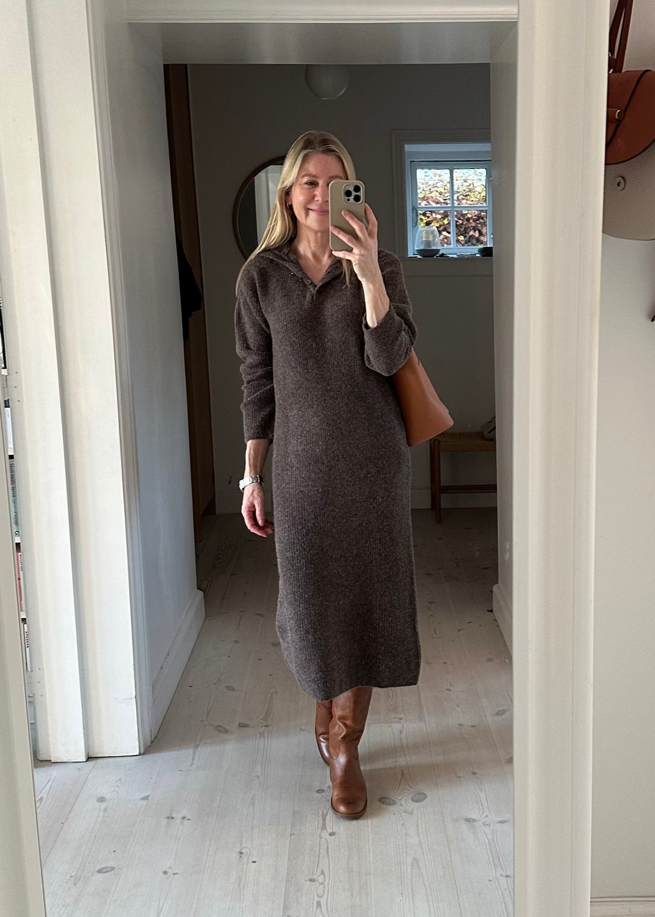 Fin strikkjole fra Karen by Simonsen. Kjolen sidder løst, og går til midt på knæet.