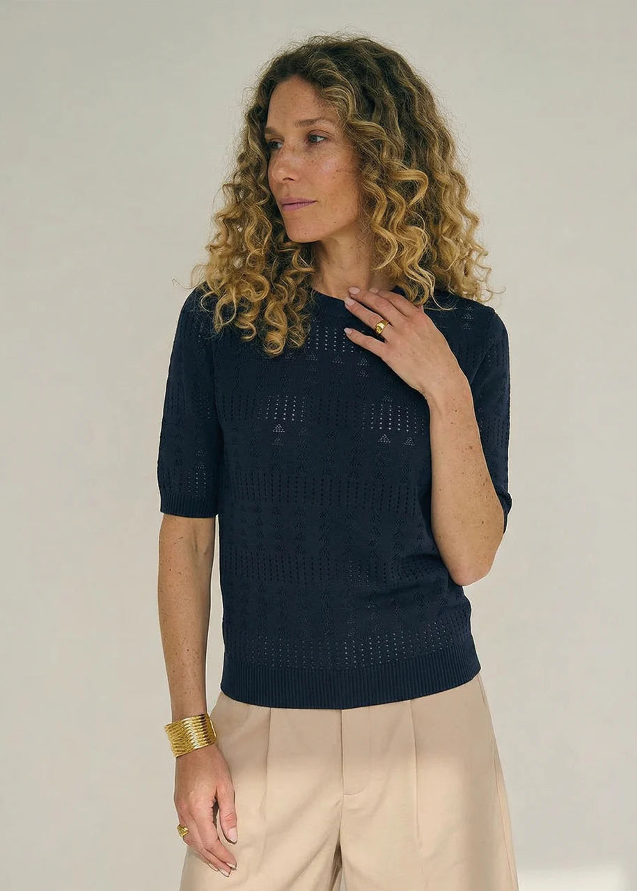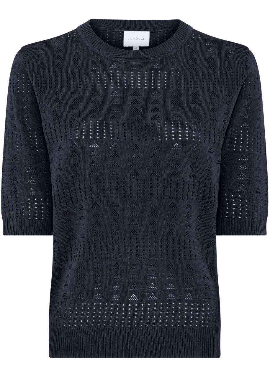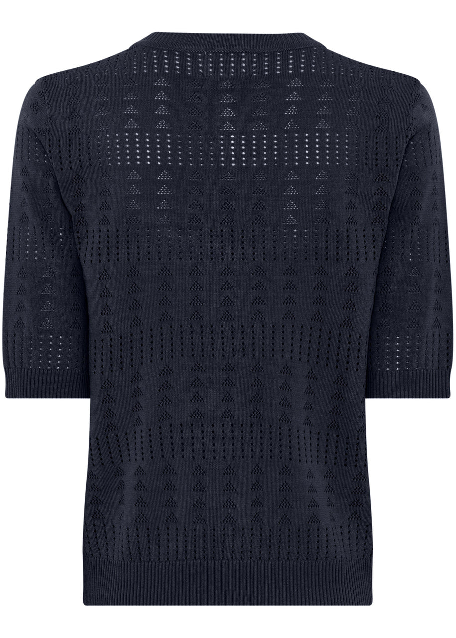 Blød navy bluse med rund hals, korte ærmer og et fint hulmønster.