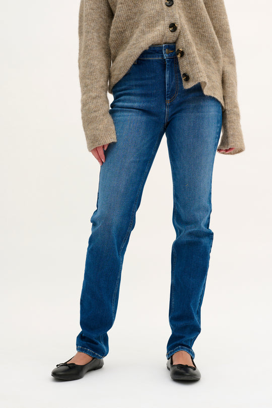 Skøn navy dunfrakke fra Part Two med ægte dunfyld. Frakken har hætte, sidelommer, skjult lynlåslukning og en smal pasform.