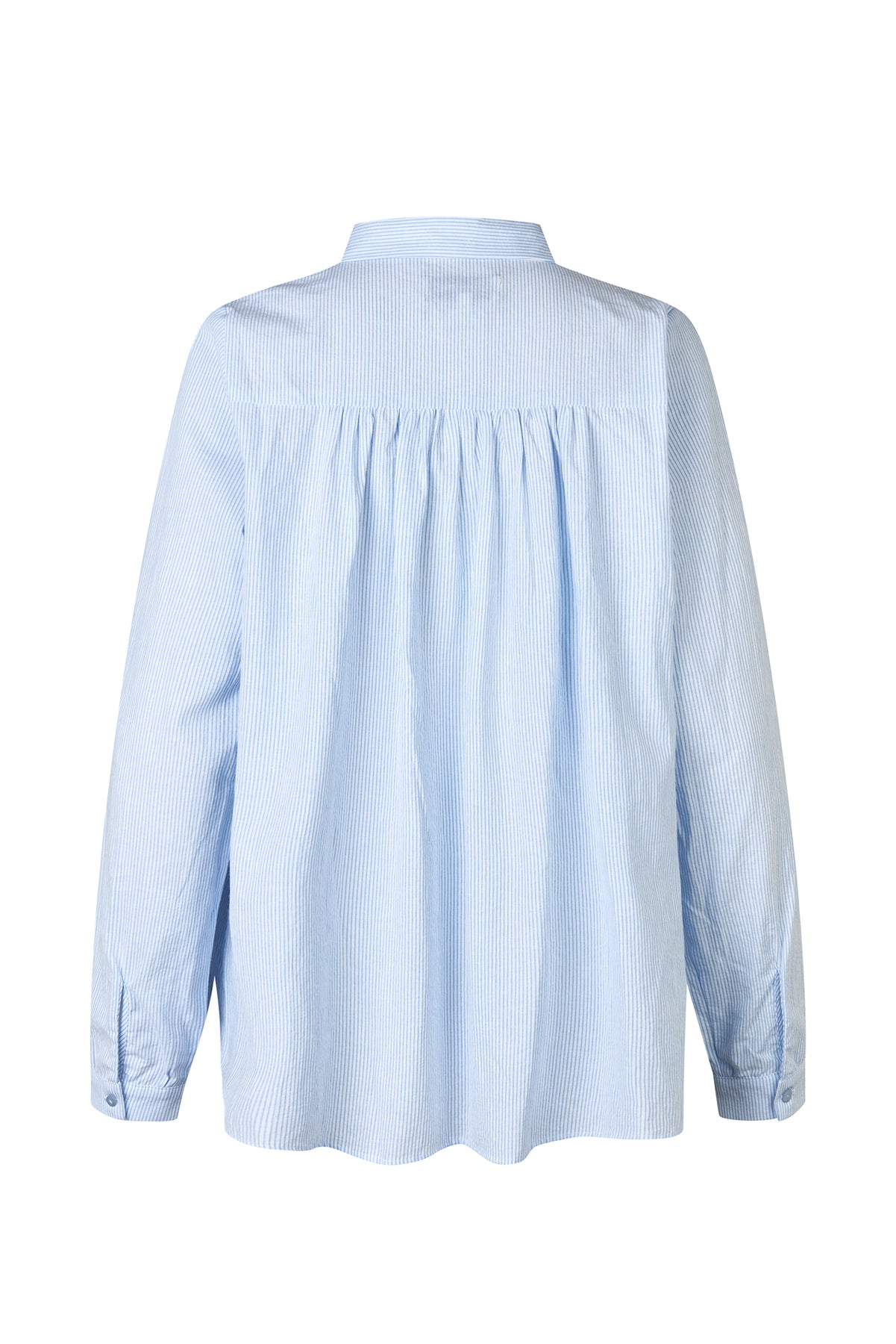 Småstribet skjorte fra Lollys Laundry. Skjorten har hvide og lyseblå vertikale striber, små læg ved skuldre og lukkes med knapper foran.