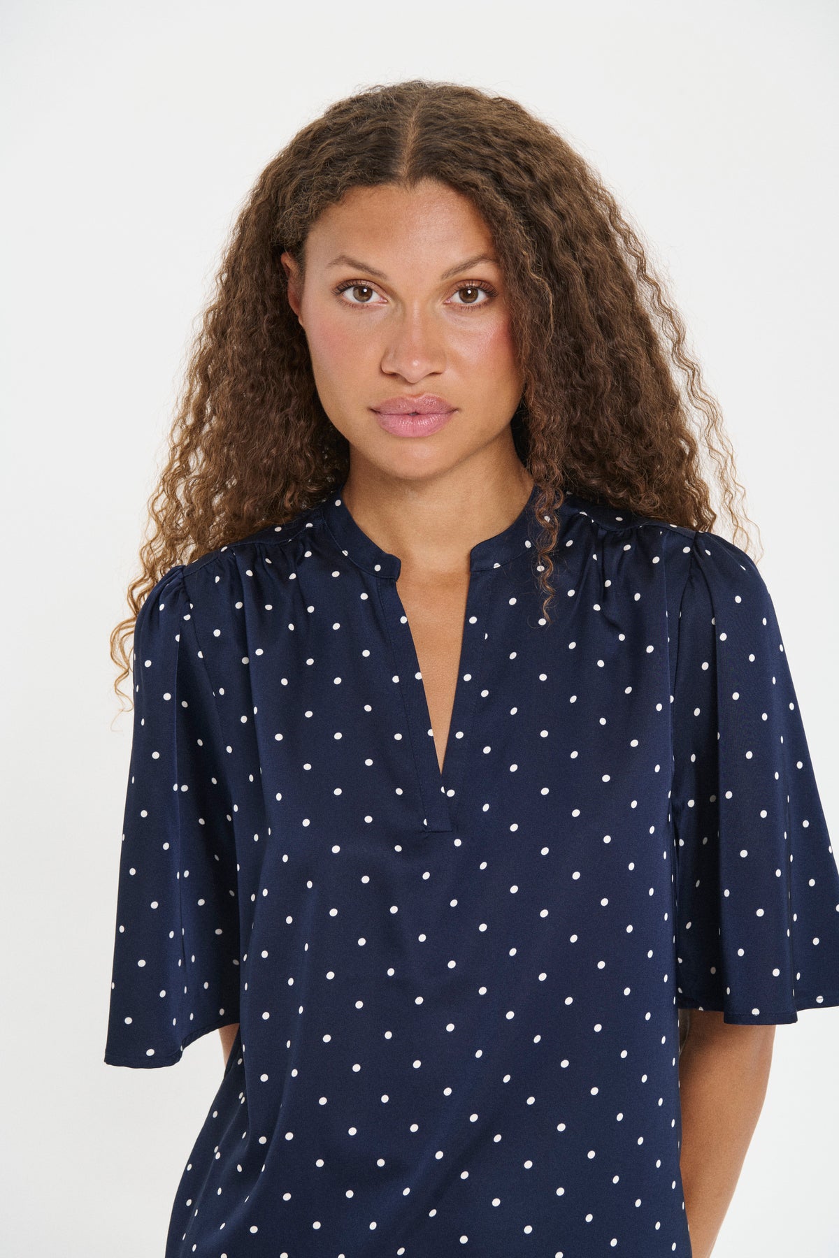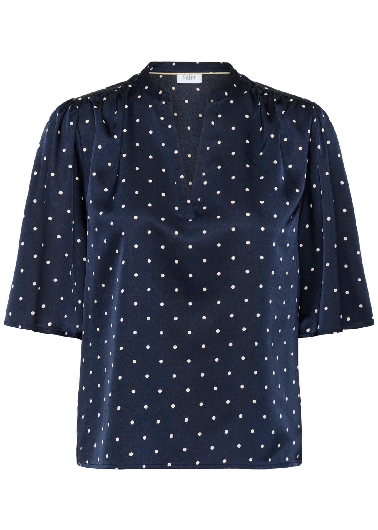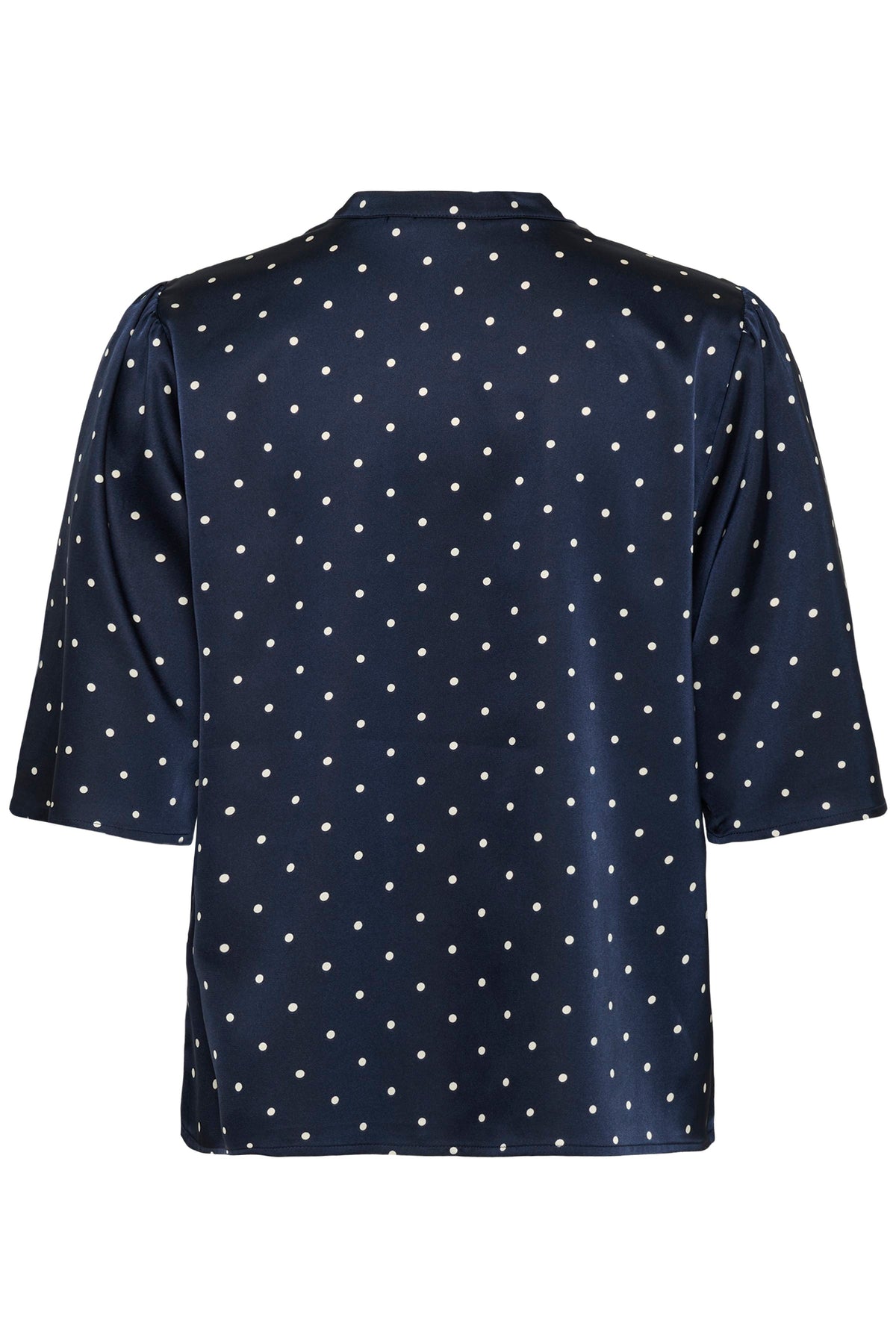 Skøn mørkeblå satinbluse med hvide prikker. Blusen har v-udskæring, brede korte ærmer og en løs pasform.