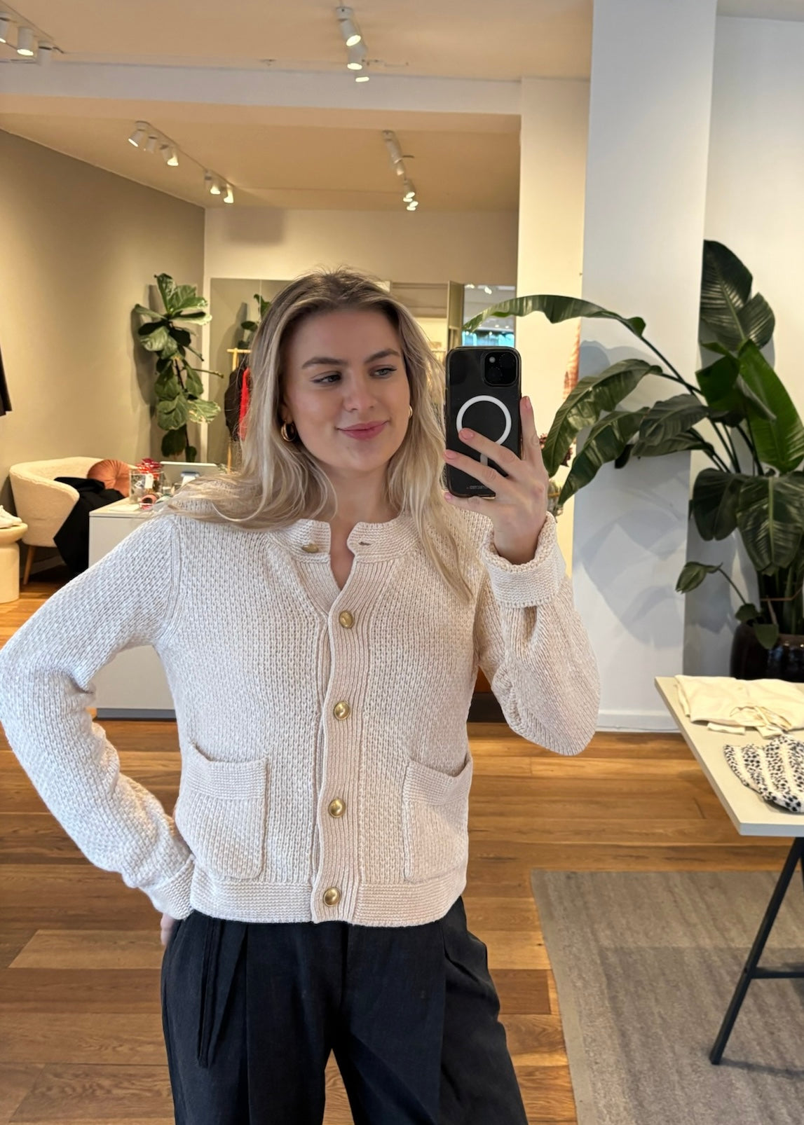 Lækker off-white cardigan fra Part Two i vævet blød viscose. Cardiganen har rund hals, fine messingfarvede knapper og påsyede lommer.