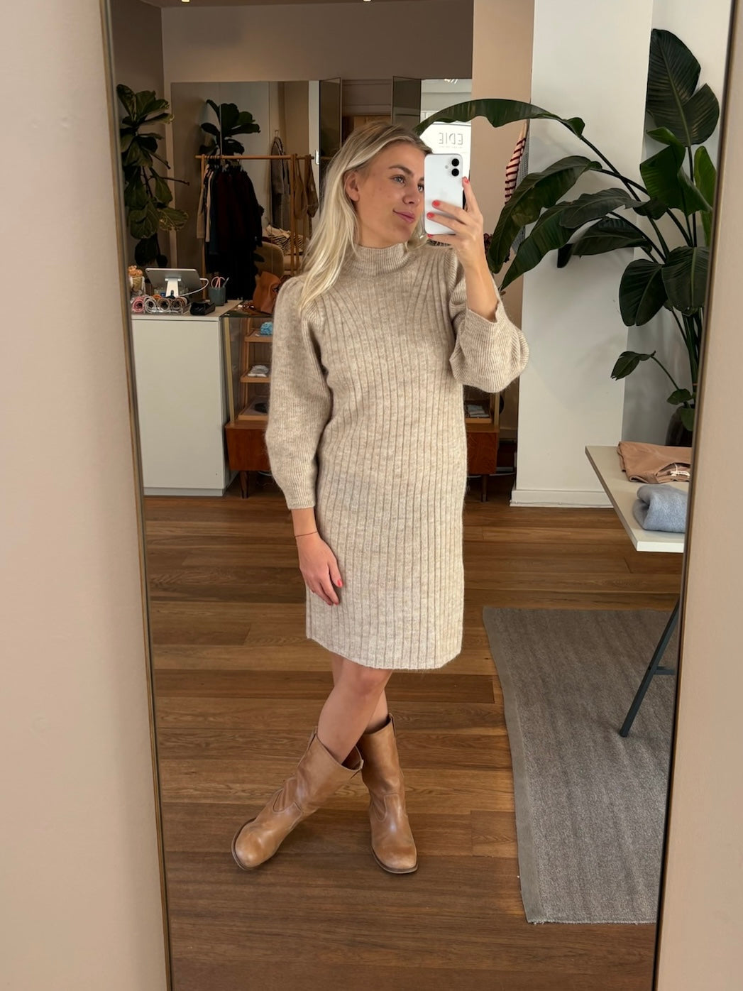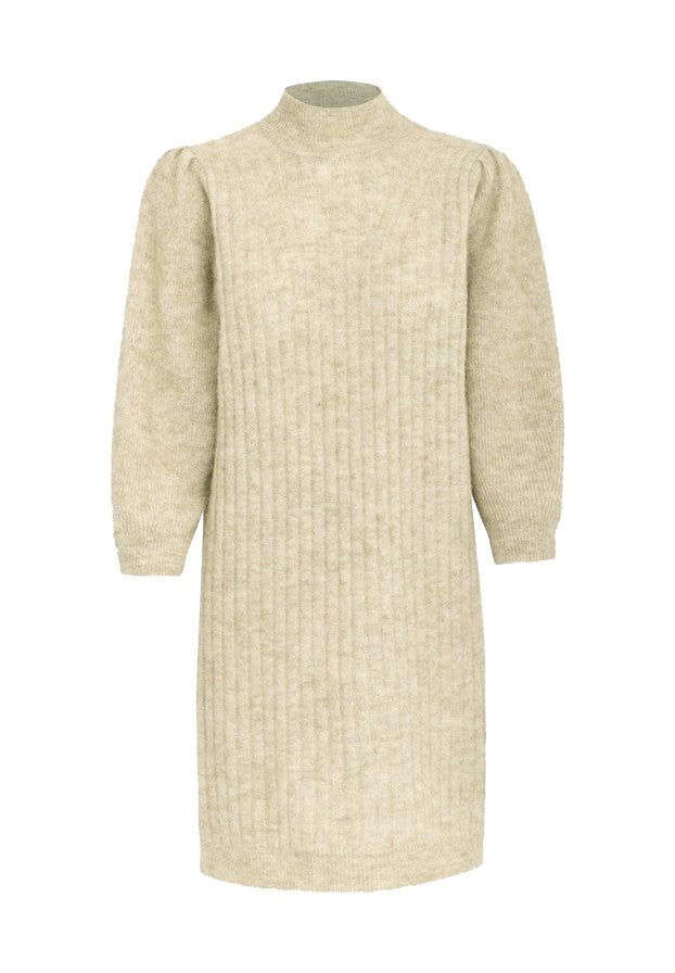 Härlig stickad klänning från Minus I mjuk kvalitet. Klänningen har en något hög nacke, 3/4 långa ärmar med lätt mops vid axlarna och en rak passform för knäna.