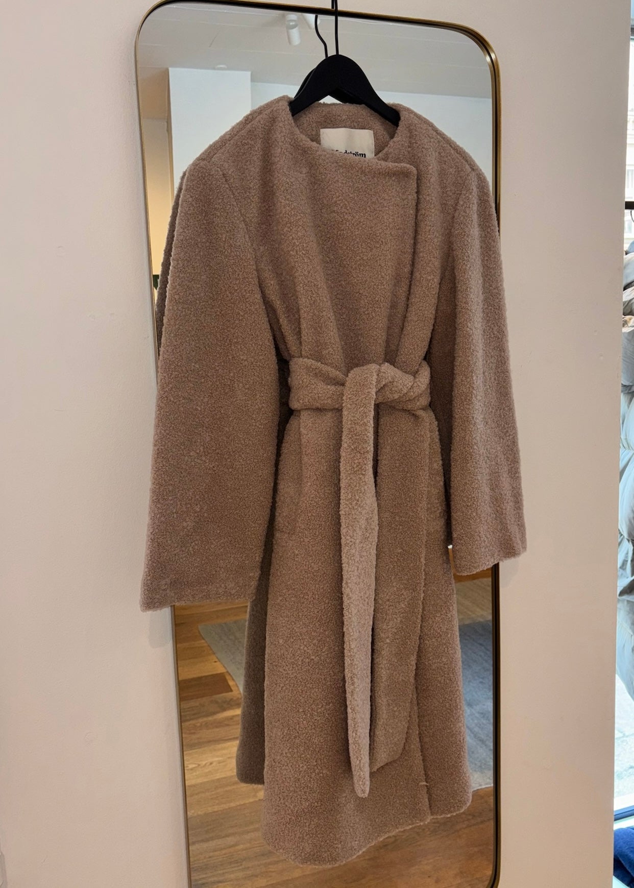 Lang og beige jakke fra Modström. Jakken har en løs pasform og bindebånd. Den har en skjult knappelukning og en slids bagpå og sidelommer.