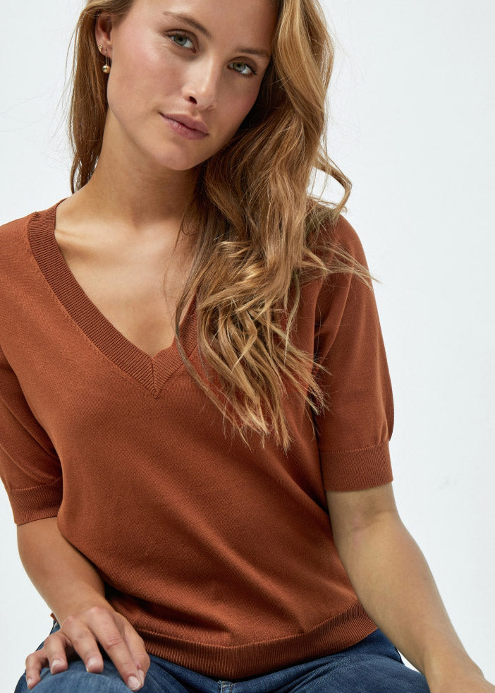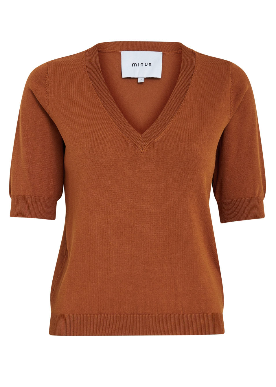 Skøn blød pullover fra Minus i fin rustfarve. Pulloveren har v-neck, korte ærmer og en smal pasform.