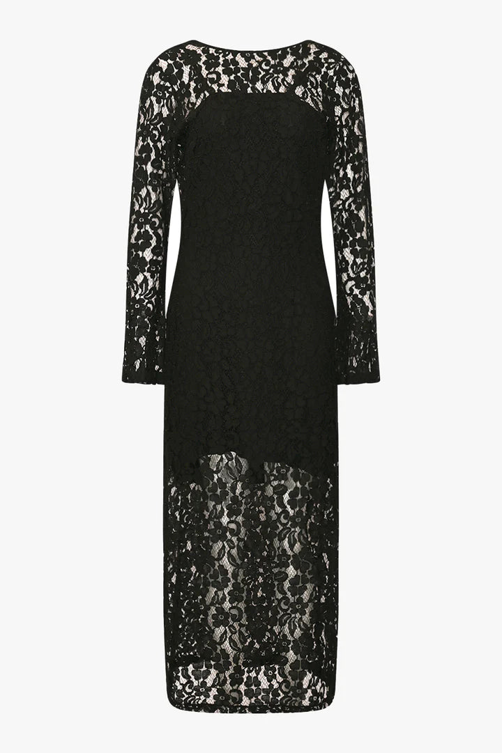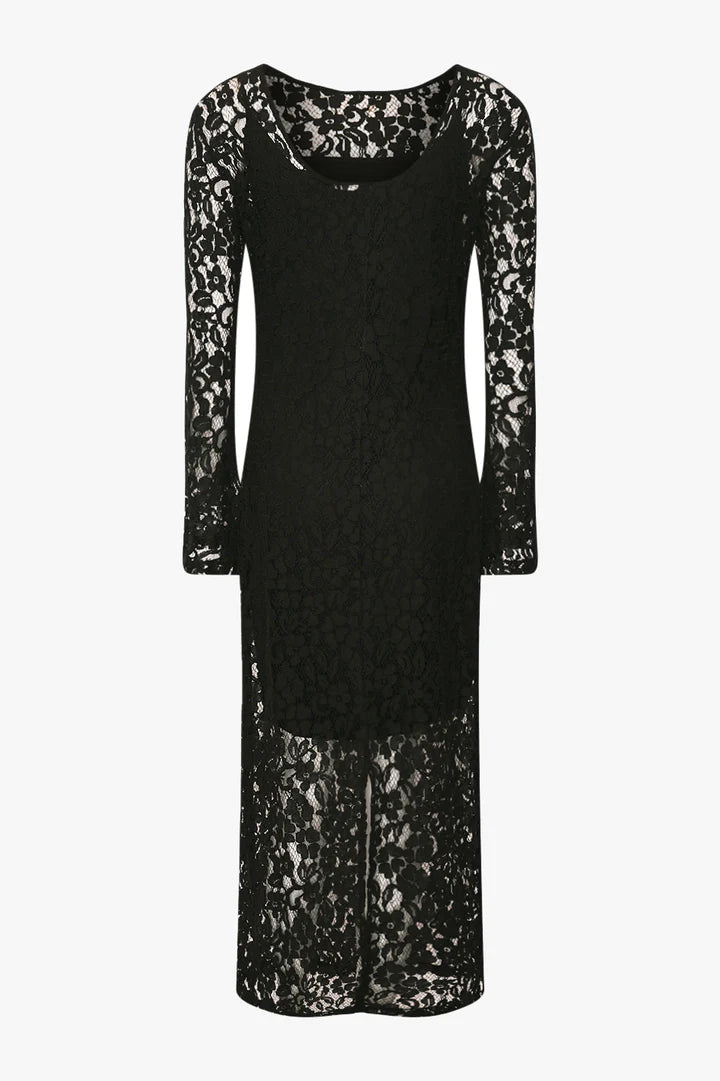 Smuk sort kjole fra Noella med elegante blonder, sort underkjole og lange ærmer.