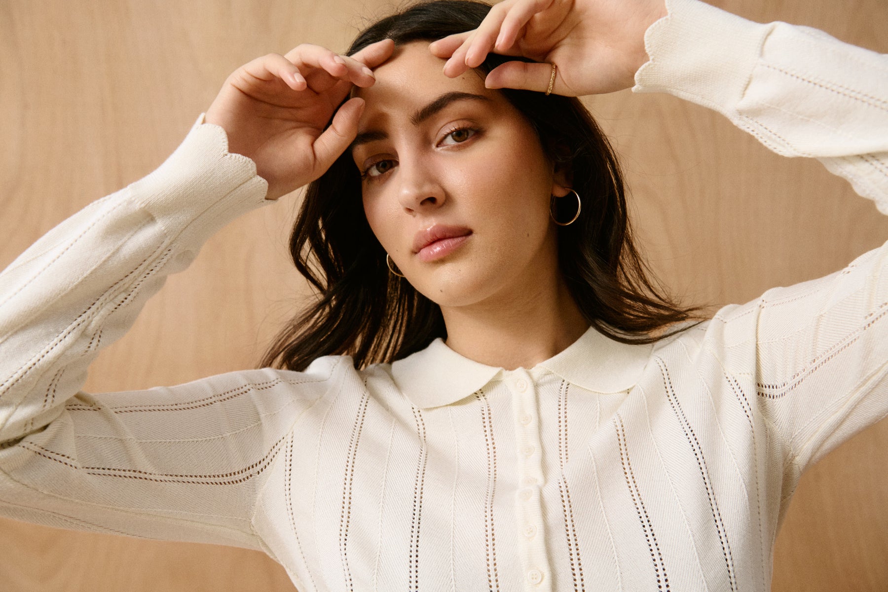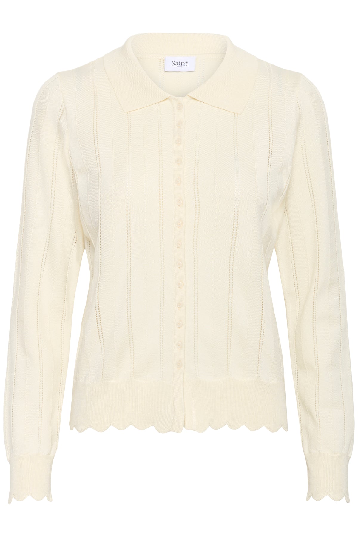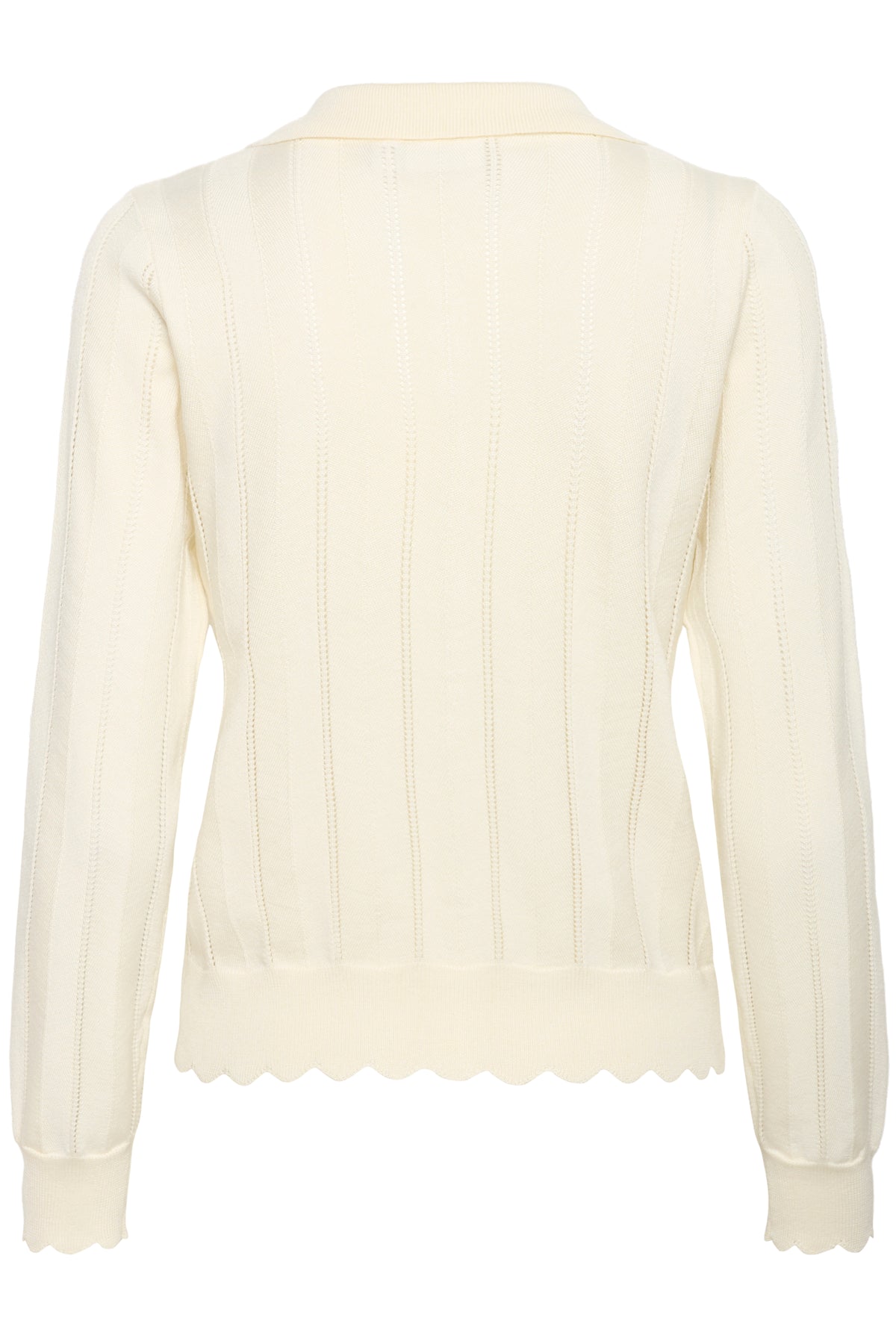 Smuk hulmønstret cardigan med krave, knaplukning og bølgede kanter.