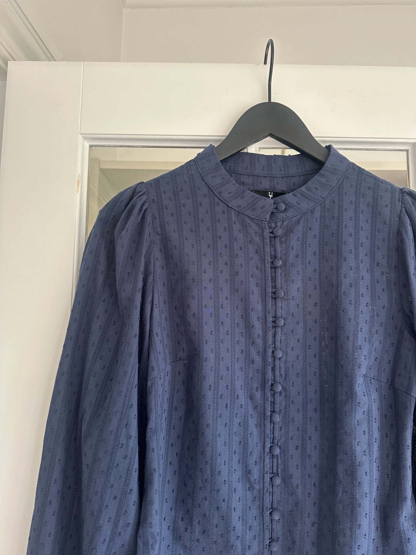Smuk navy skjortebluse fra Urban Pioneers med flot struktur i stoffet. Skjorteblusen har høj kinakrave, stofbeklædte knapper og lange ærmer med lille puf.