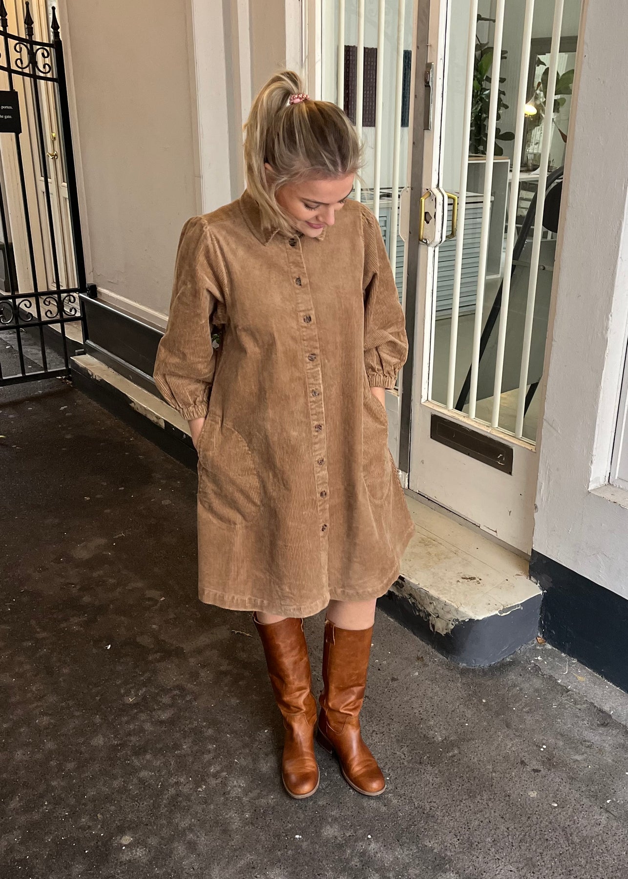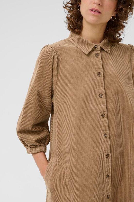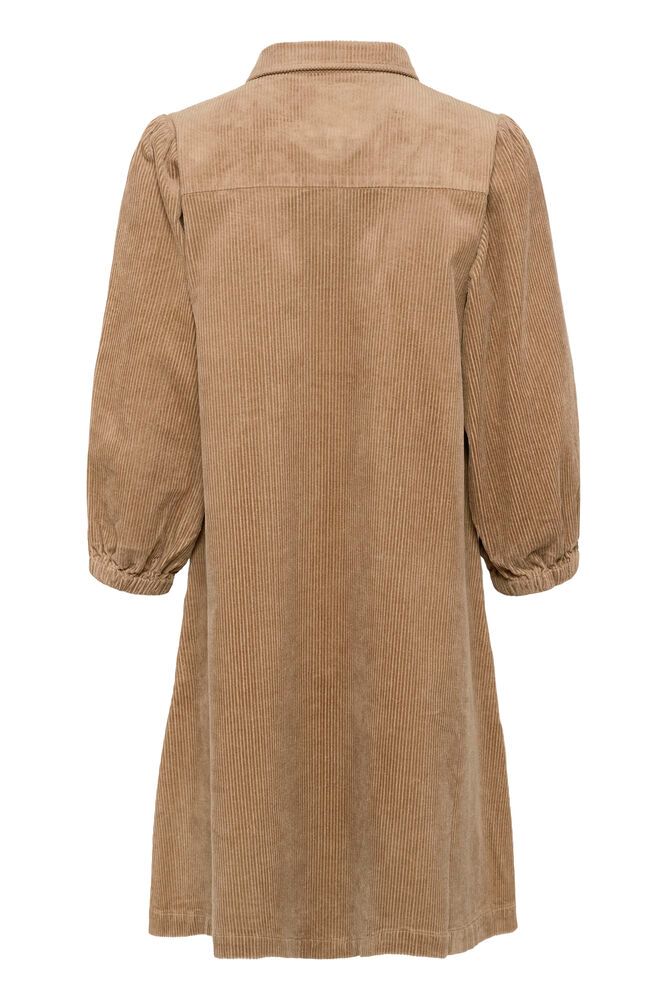 Smuk lysebrun fløjlskjole fra Part Two. Kjolen har krave, knaplukning, sidelommer, let stumpede ærmer og en feminin A-form.