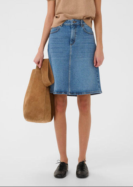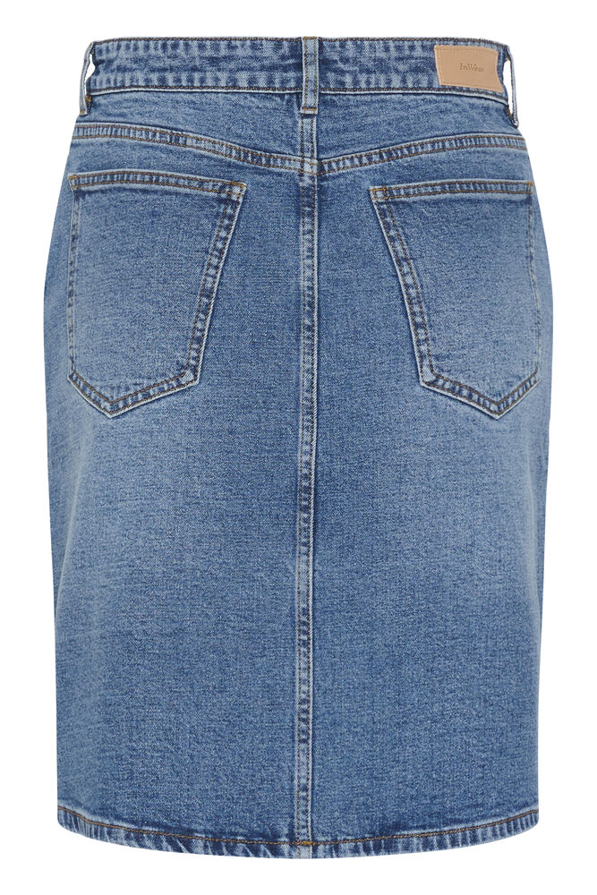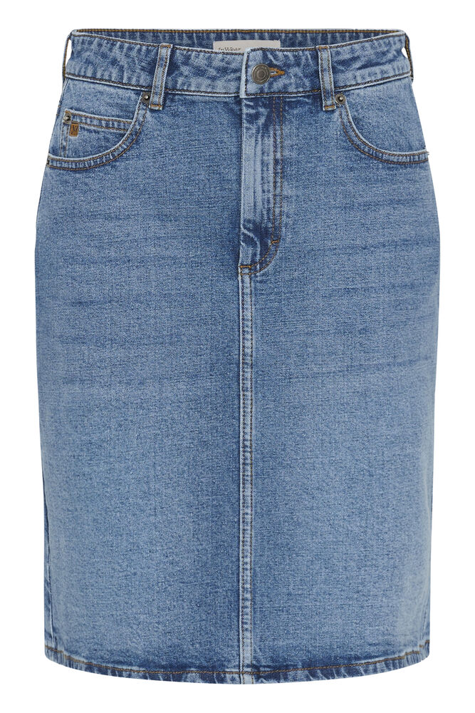 Klassisk denimnederdel med sidelommer, baglommer og knap- samt lynlåslukning.
