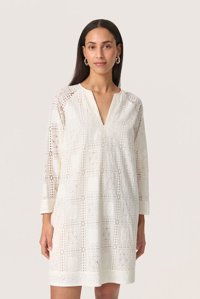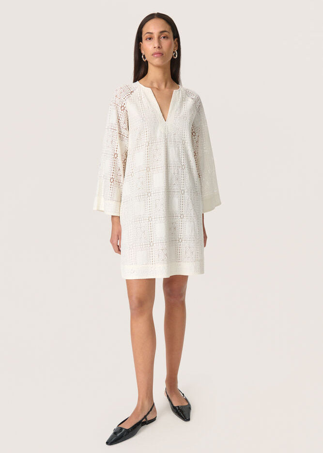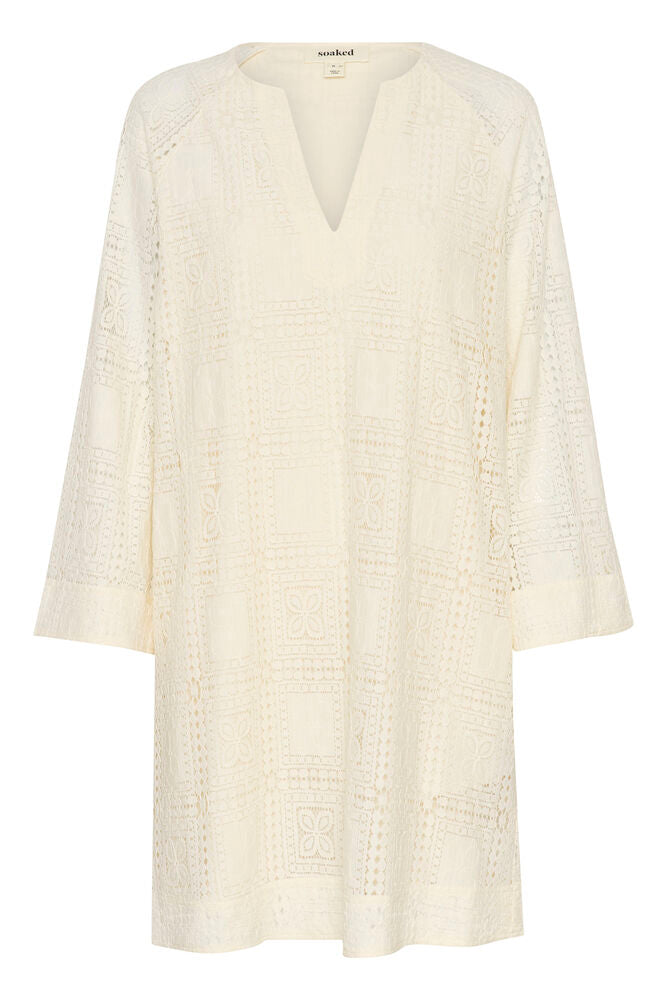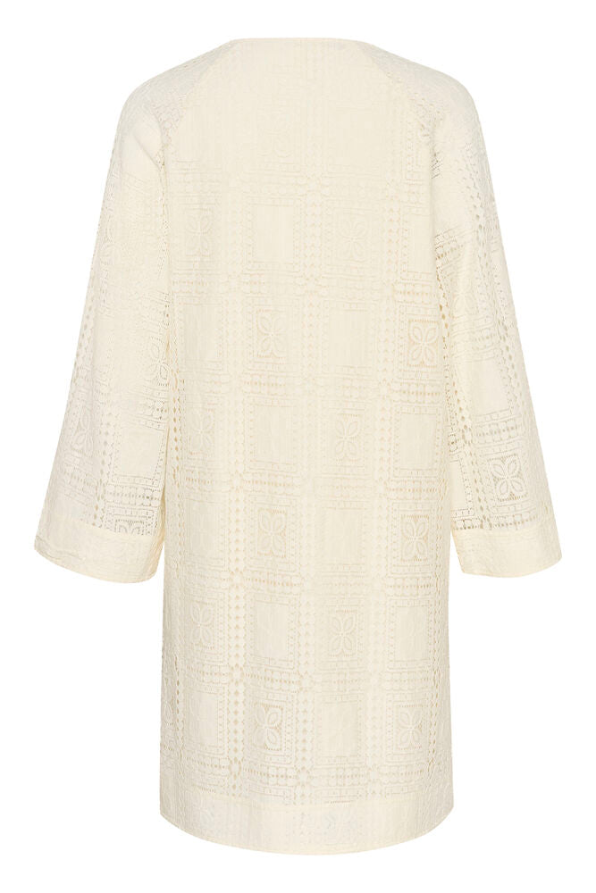 Smuk off-white kjole med hulmøster, v-udskæring og lange løse ærmer.
